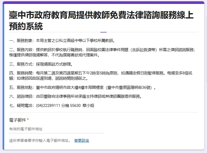 教育局表示,教師免費法律諮詢服務全面採行網路預約制度,並於每月1日上午10時開放當月名額登記,現場面談諮詢服務時間定於每月第二、四週的週五下午2時至5時。此外,為了讓更多老師受惠,每人每次諮詢時間以20分鐘為限,地點設於台中市政府陽明市政大樓4樓教育局開標室(網路預約網址: https://reurl.cc/N2RA1e )