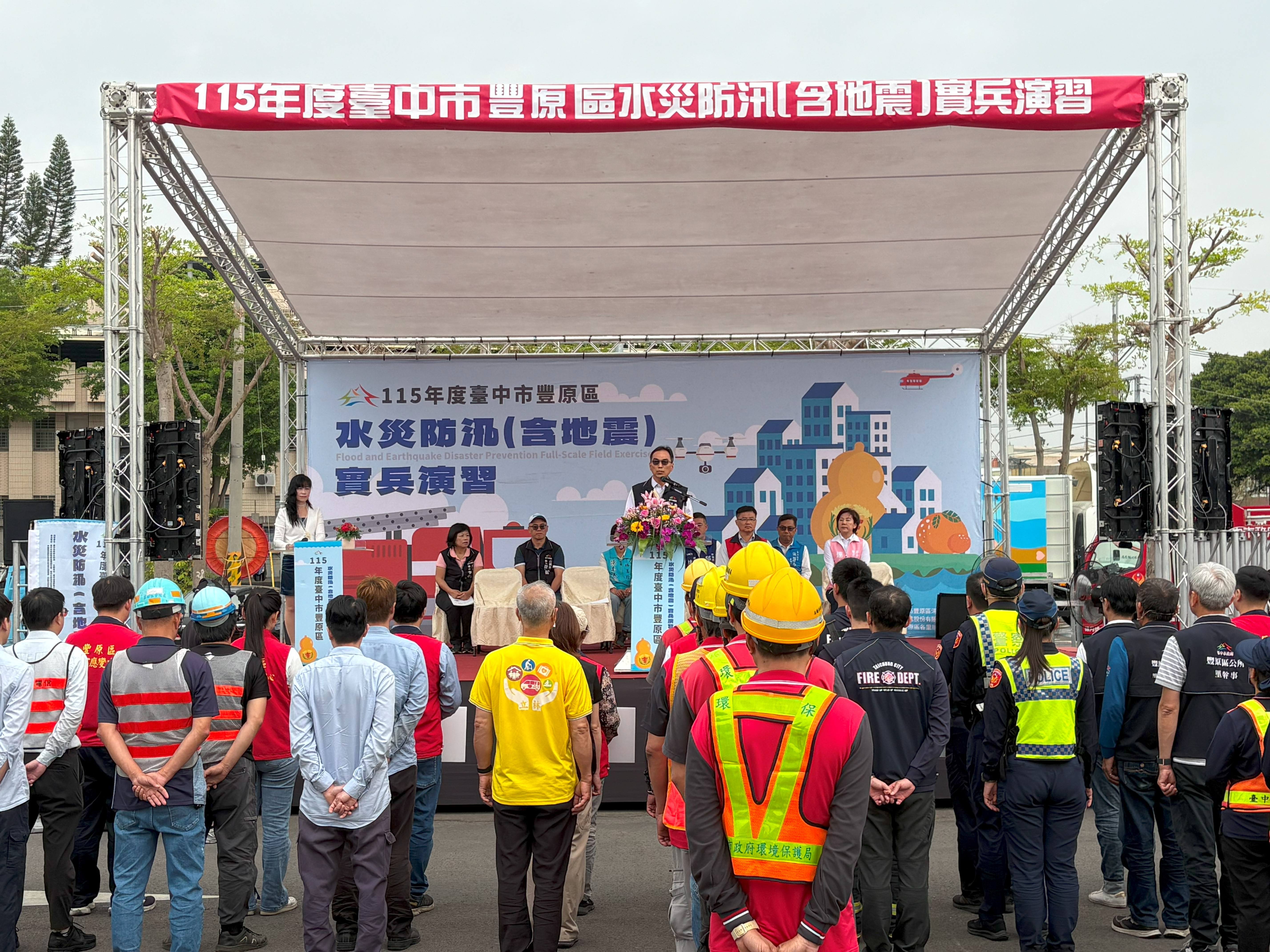 此次演習由市府水利局主任秘書林志鴻擔任統裁官,豐原區長洪峰明擔任指揮官,整合消防局、警察局、環保局、衛生局,以及台灣電力公司、自來水公司、中華電信公司、欣彰天然氣公司、國軍後備指揮部等單位共同參與,並由南村里里長謝見忠率環保志工隊投入支援,結合公私部門與志工力量,強化整體防救災協作能力。現場亦有水利局、消防局、警察局豐原分局、區公所代表及各級民意代表、里長到場觀摩。