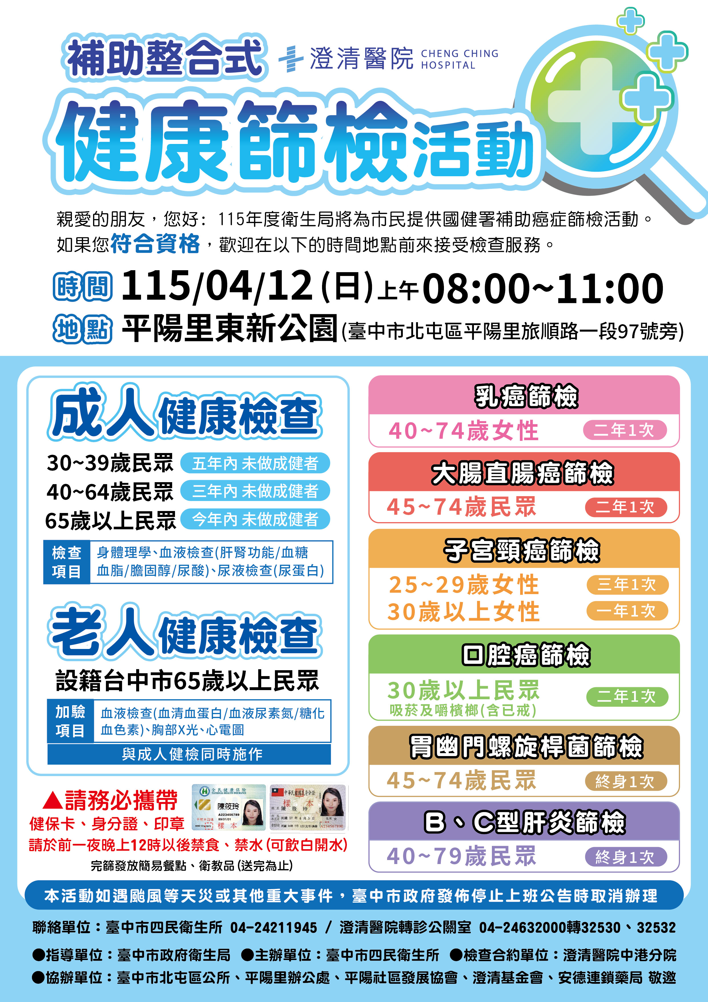 115年4月12日上午(週日)整合性預防保健篩檢活動--東新公園(臺中市北屯區平陽里旅順路一段97號旁)