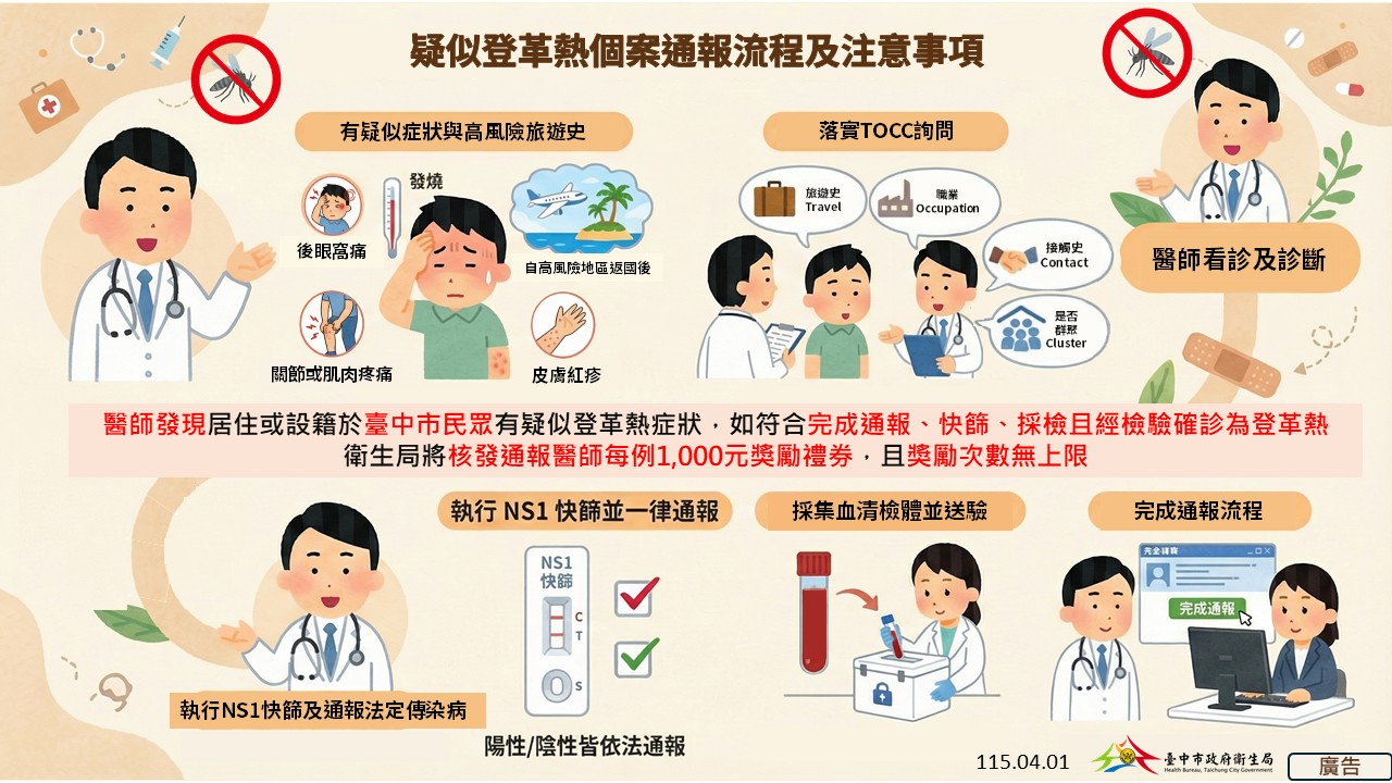 衛生局進一步說明,醫療院所應加強詢問TOCC(旅遊史、職業別、接觸史及群聚情形),如遇疑似個案可搭配登革熱NS1抗原快篩輔助診斷,並於24小時內完成法定傳染病通報。市府也持續推動通報獎勵制度,凡符合通報、採檢並確診個案,醫師每例可獲1,000元獎勵,民眾於機場主動通報或發病3日內就醫並告知旅遊史者,亦可獲500元獎勵。