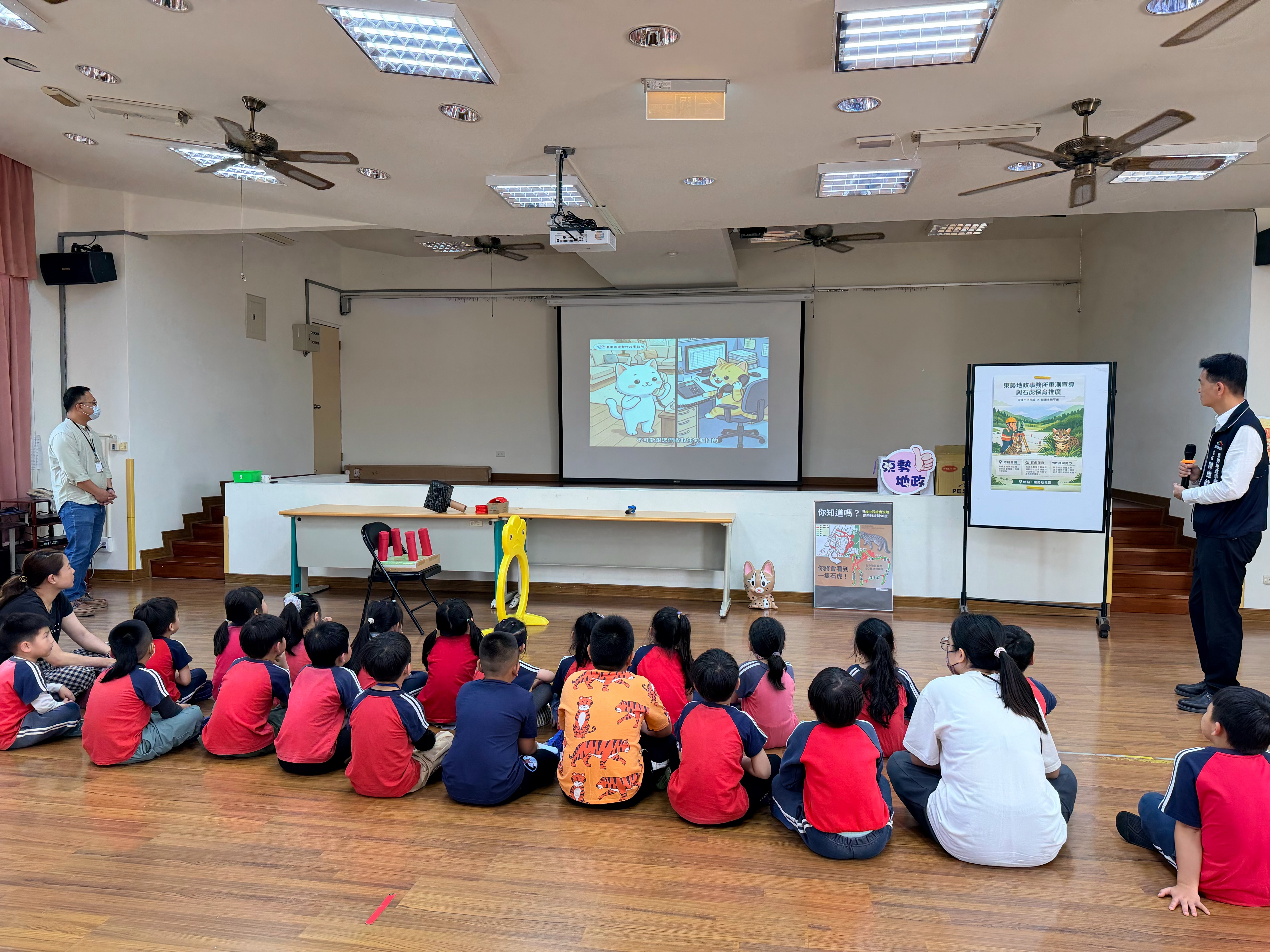 台中市政府東勢地政事務所在兒童節前夕,前往目前進行地籍圖重測區內之新社區大南國小、東勢幼兒園等校園與社區里鄰聯誼會,透過自製AI動漫影片寓意石虎保育,與體驗重測儀器的生動活潑方式,讓學童認識地籍圖重測作法與重要性,將產權觀念向下扎根。
