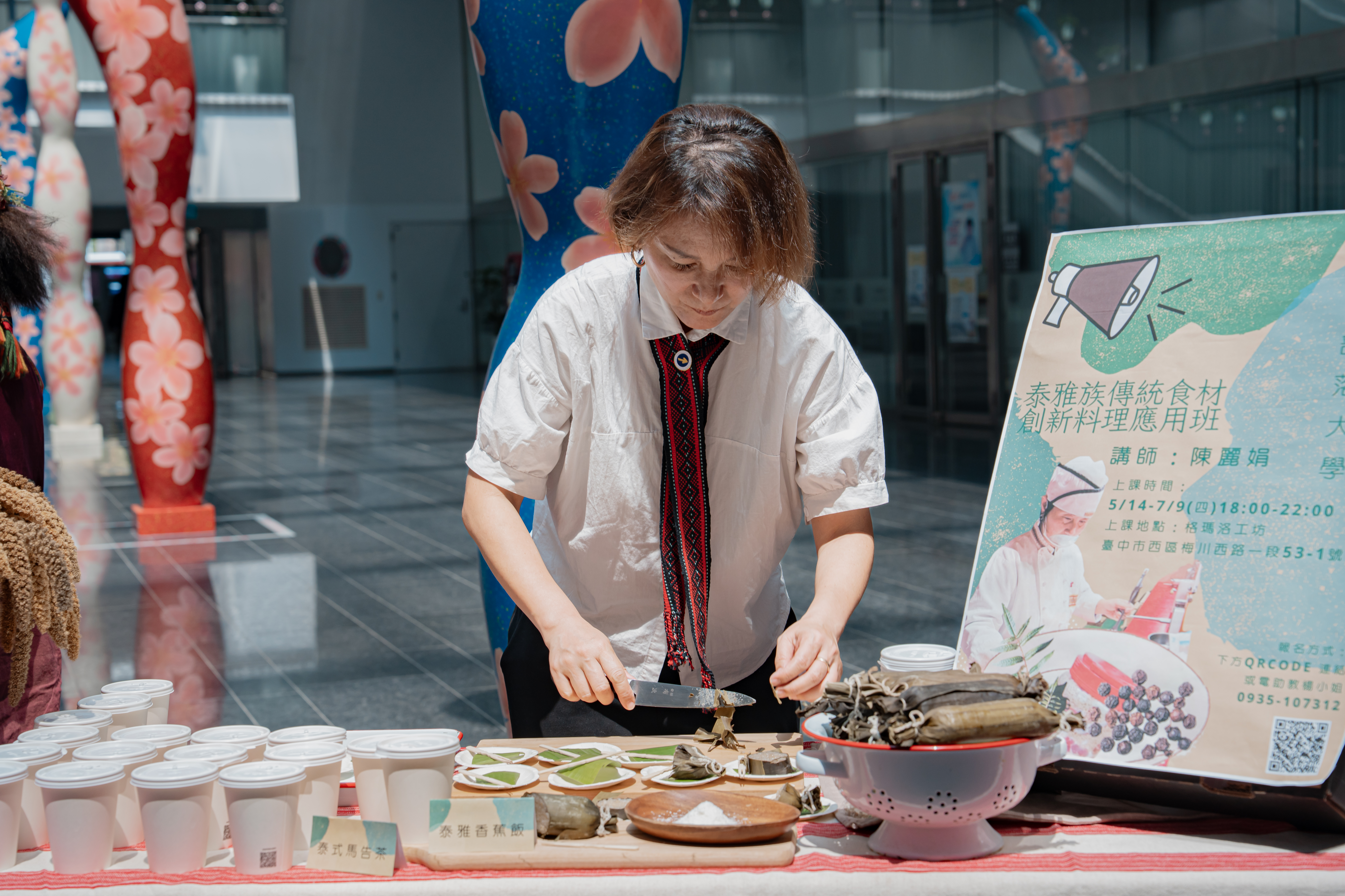 此次開學典禮亦以「課程走秀展演」為亮點,結合國立勤益科技大學原資中心學生參與,透過動態展演呈現編織、服飾、陶藝、皮雕及飾品創作等課程成果,讓文化從靜態展示轉為生活化、可感的體驗;現場同步設置體驗攤位,讓民眾透過實作與互動,更深入認識原住民族文化內涵。