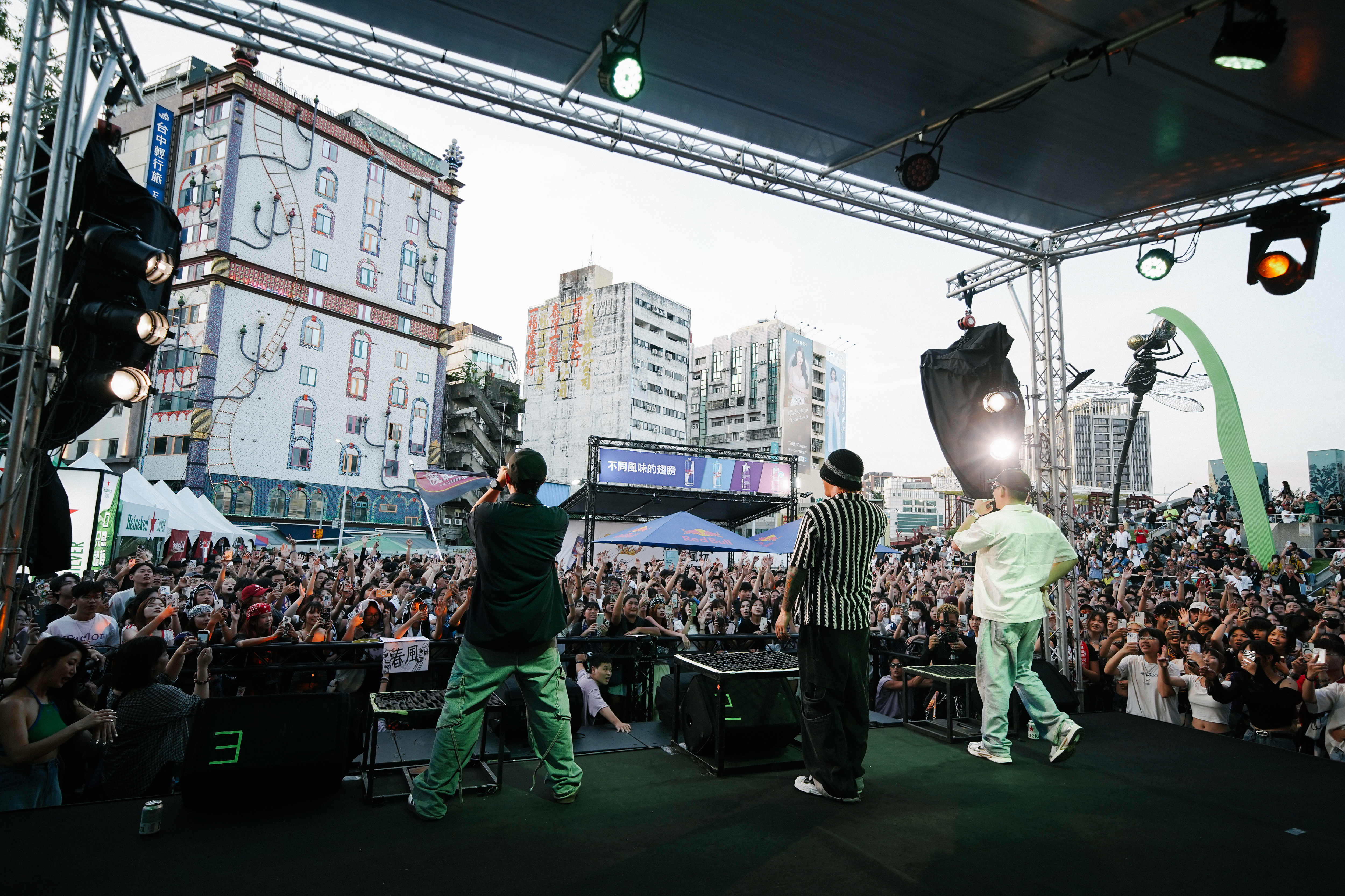 除大型商演外,戶外音樂祭同樣展現台中不容小覷的流行音樂能量。由新聞局協辦的海線代表性音樂祭「浮現祭」連年完售,2022年網路聲量勇奪全台第二,並榮獲2025年美國MUSE Creative Awards活動類鉑金獎,成功帶動海線觀光與周邊產業發展,成為音樂結合地方創生的指標案例。新聞局主辦的「搖滾台中」持續深化國際交流,2024、2025年與日本最大戶外音樂祭FUJI ROCK FESTIVAL合作,引進ROOKIE A GO-GO舞台來台,兩年累計吸引超過18萬人次湧入文心森林公園,展現台中國際級戶外音樂節的策展規模與城市號召力。此外,《玖壹壹南北貳路音樂節》亦為大型戶外公園音樂節的成功典範。本土天團玖壹壹於水湳中央公園以專場結合音樂節形式舉辦演出,吸引逾10萬人次參與,帶動周邊旅宿接近滿房,顯示「大型戶外公園演唱會經濟模式」已在台中穩健成形,進一步鞏固台中作為全台戶外音樂祭重鎮的地位。