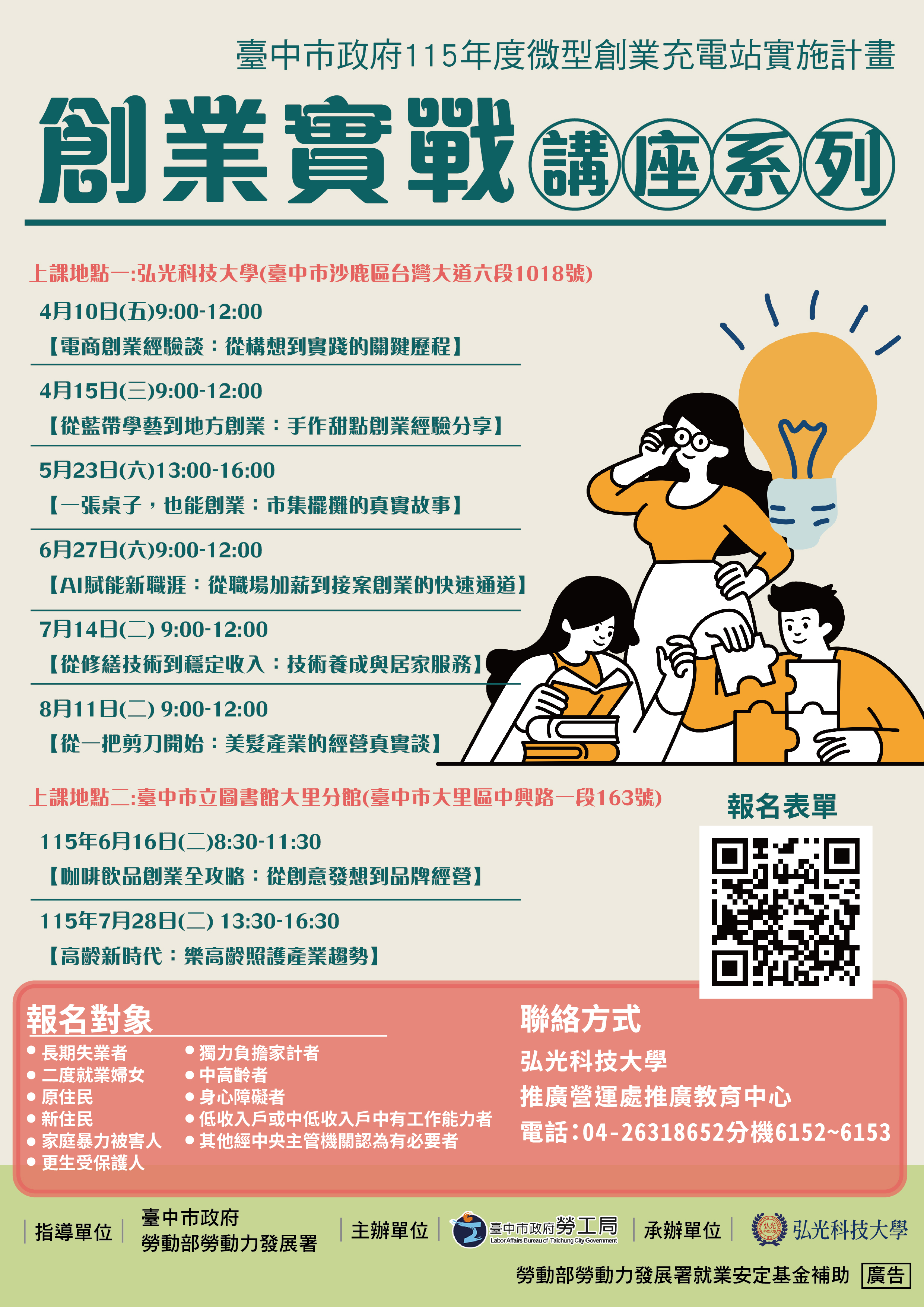勞工局表示,歡迎有創業規劃或正在創業的市民把握機會參與相關課程與輔導服務,115年度活動資訊可至勞工局官網查詢(https://www.labor.taichung.gov.tw/1229008/1229015/1247865/1303755/1303769/1303770/post),或電洽04-22289111轉35616洽詢。(4/8*4)*勞工局