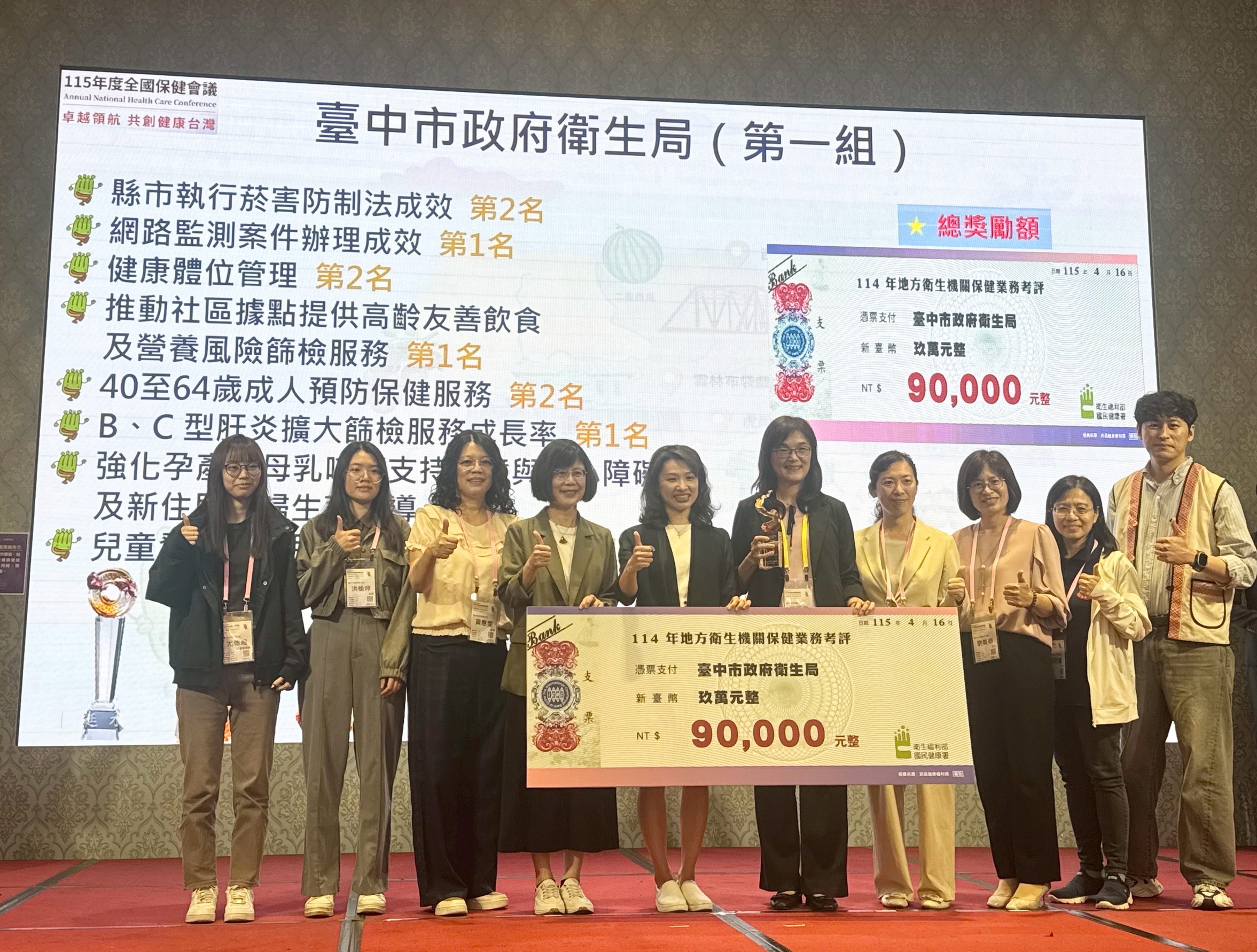 衛生福利部國民健康署今(16)日於雲林舉辦「115年度全國保健會議」,表揚114年度保健業務考評績優單位。台中市在全國22縣市激烈競爭中表現亮眼,不僅榮獲保健類總成績全國第一,更獲頒保健業務類第一組優等獎,整體表現再創高峰。