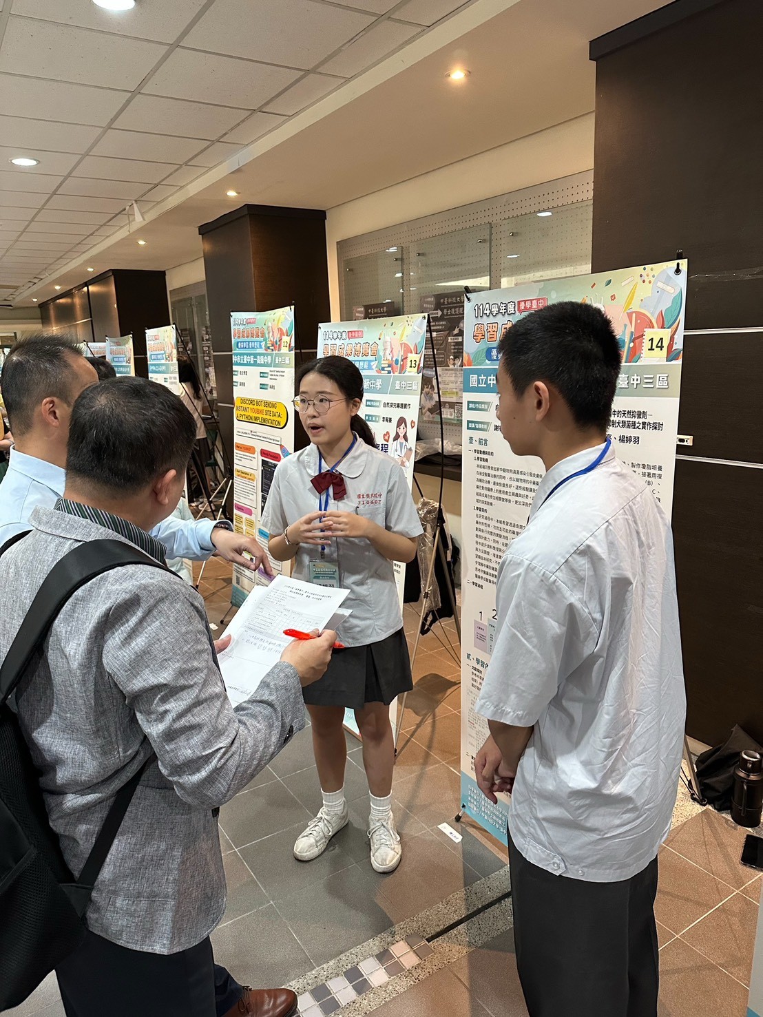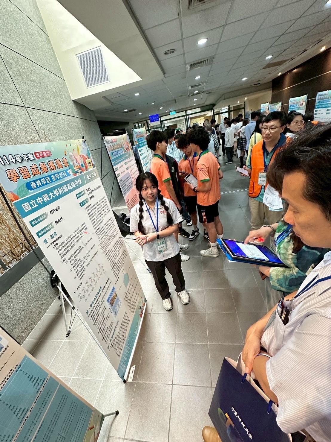 今日活動現場亮點十足!華盛頓高中李宥蓁以「心心相印」為題,分享心臟解剖實作與急救訓練的科學探究旅程,展現深厚的職涯潛力;台中女中黃薏璇則投入AI領域,現場解析CNN模型訓練,展現優異的數位素養;興大附中林冠廷、許立揚透過手作起重機進行受力結構分析,體現工程探究精神;霧峰農工參展團隊則針對校園開放外食議題進行公民思辨,展現出對社會議題的觀察與實踐。