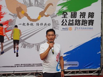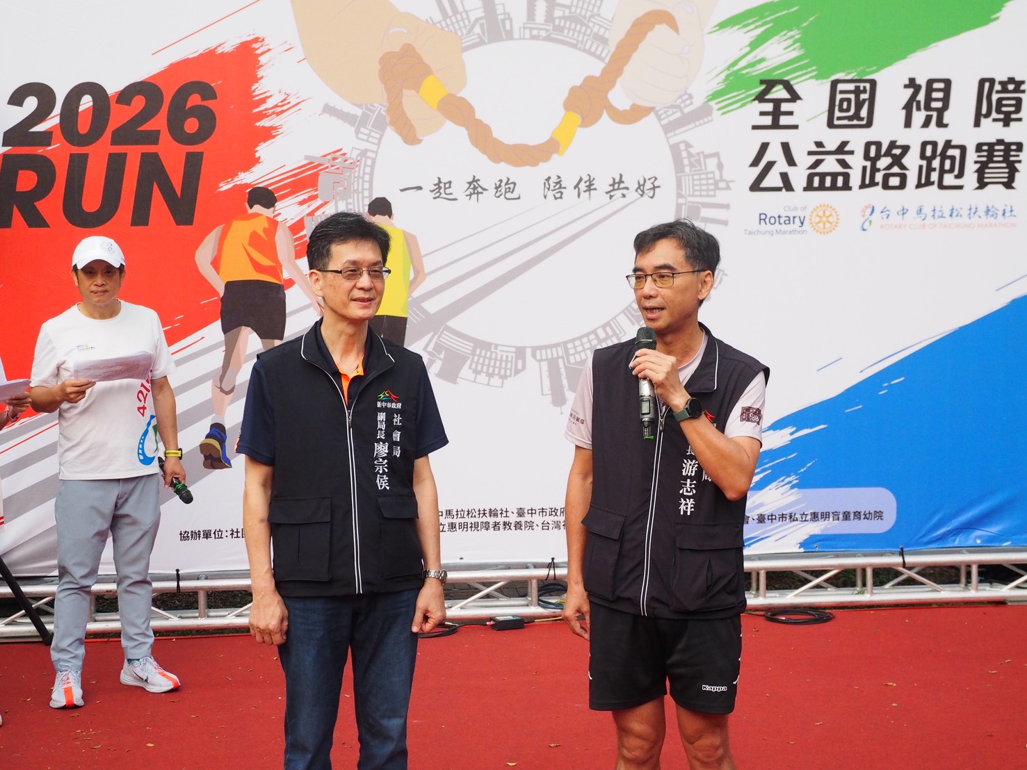 運動局長游志祥代表市長盧秀燕到場為跑者加油,並感謝台中馬拉松扶輪社推動此項別具意義的公益活動,讓視障朋友能安心參與運動、突破限制,開啟更多生活可能。游局長表示,市府持續以「運動平權」為核心,透過多元賽事設計,讓不同族群共享運動帶來的健康與快樂,而視障路跑透過陪跑繩串聯跑者與陪跑員,更象徵信任與社會支持的力量。