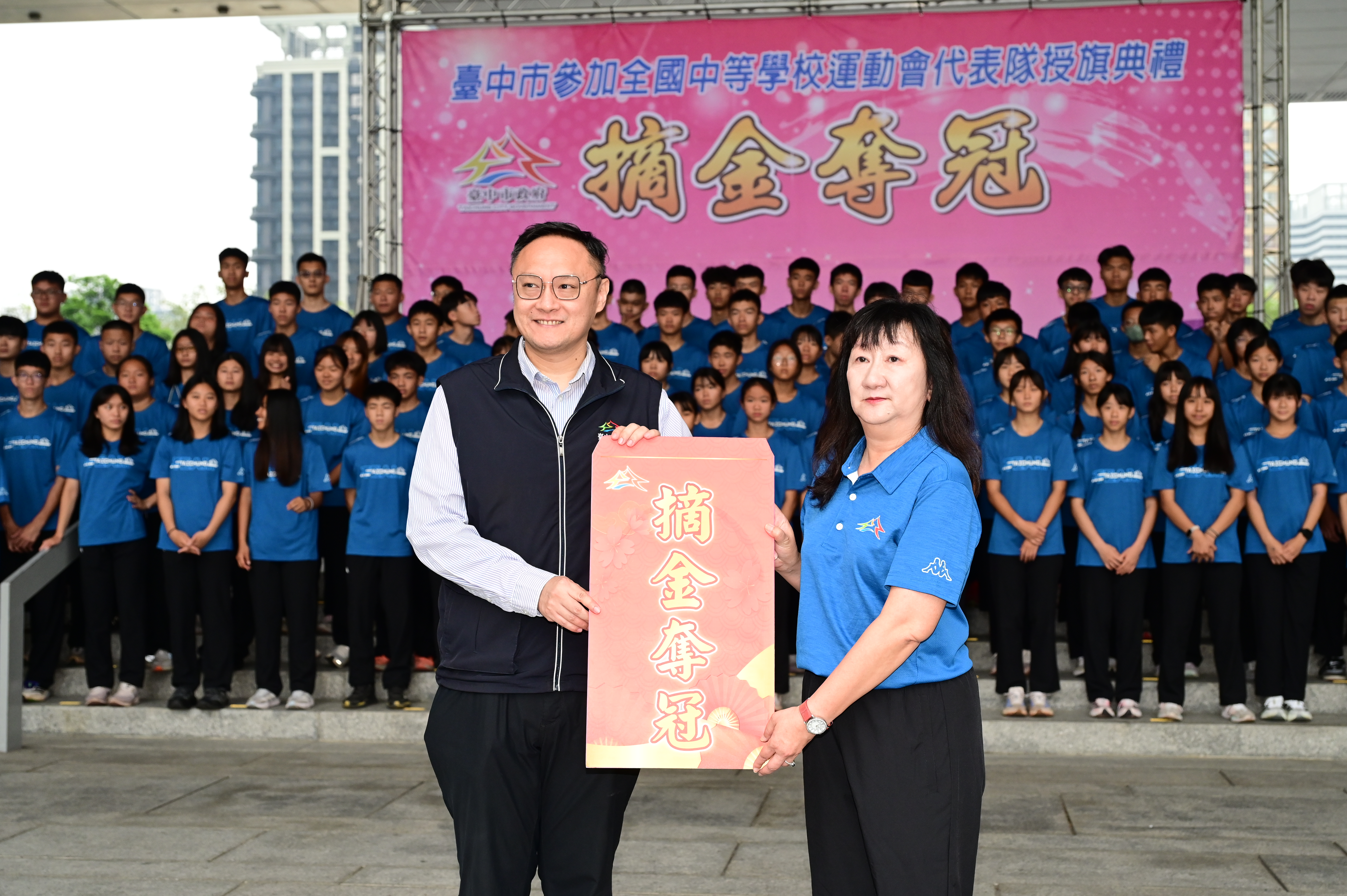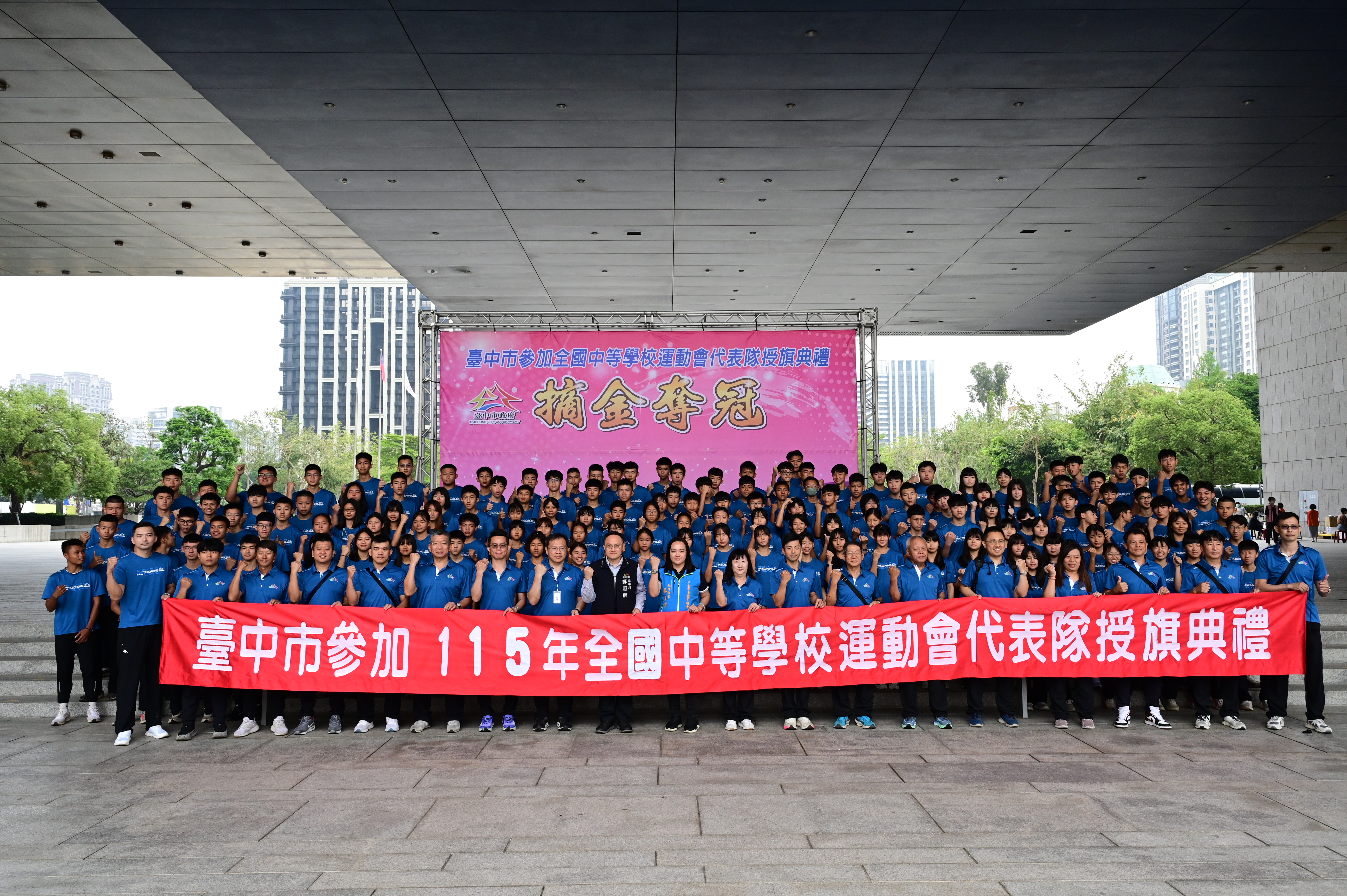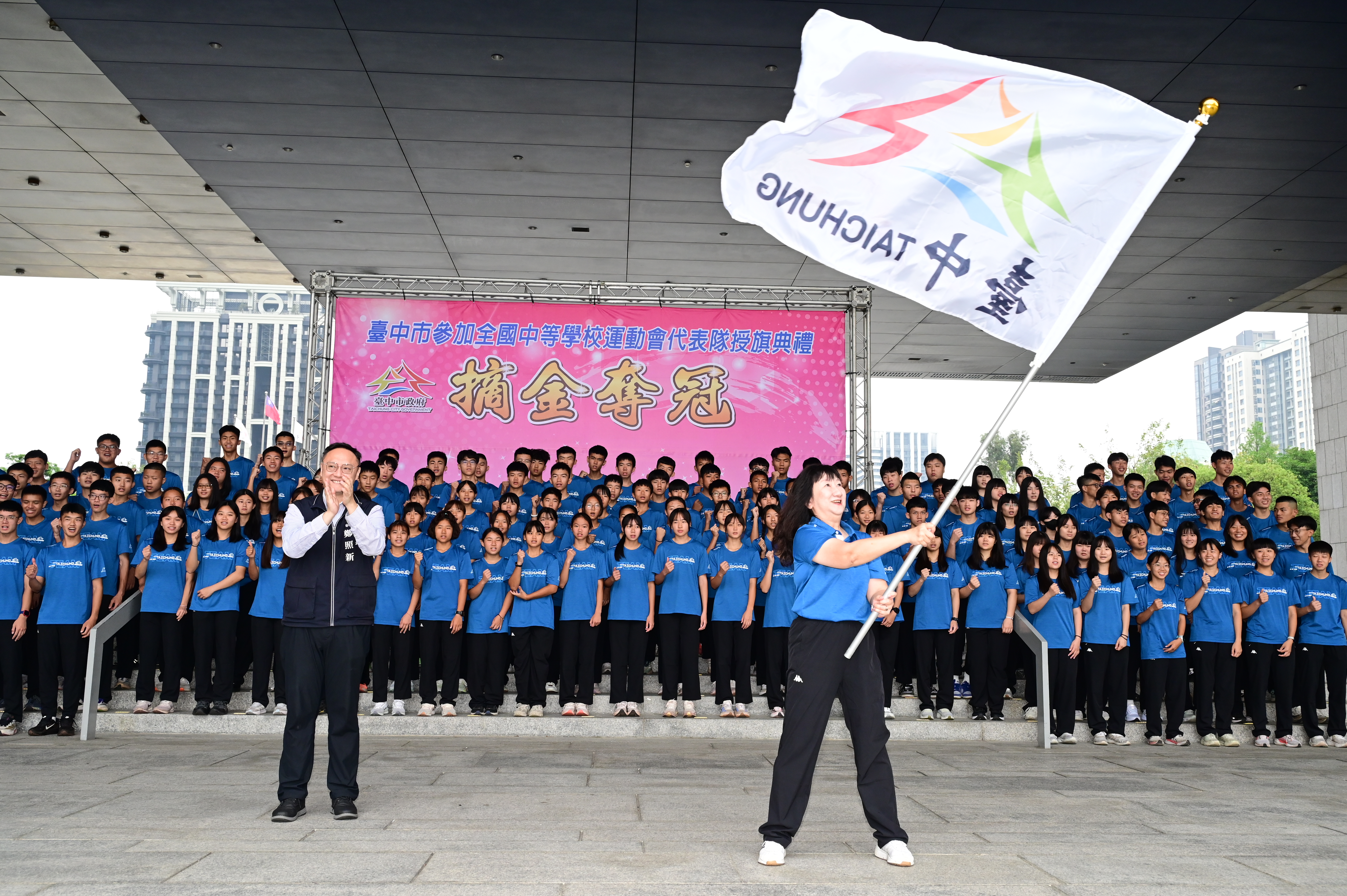 115年全國中等學校運動會今(18)日在嘉義縣開幕,台中市副市長鄭照新代表市長盧秀燕於市政大樓府後廣場為台中市代表隊授旗,並致贈加菜金,勉勵選手全力以赴、再創佳績,為台中爭取最高榮譽。