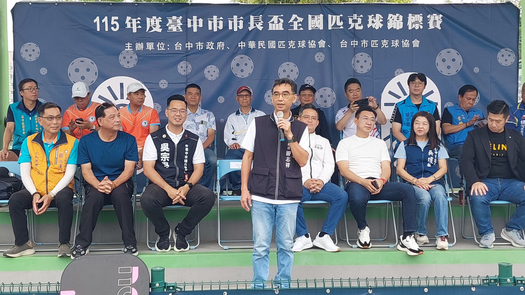 今日活動,立法院副院長江啟臣、立法委員黃健豪、市府運動局長游志祥、中華民國匹克球協會理事長楊哲明及榮譽理事長陳朝鍵、市議員暨臺中市匹克球協會理事長吳瓊華、市議員暨北區體育會理事長陳文政、台中市國道四號網球協會理事長陳文彬、玖壹壹洋蔥及健志等人皆出席,立法委員楊瓊瓔、顏寬恒、市議員張廖乃綸、沈佑蓮、吳振嘉、陳政顯等人也派代表到場共襄盛舉。