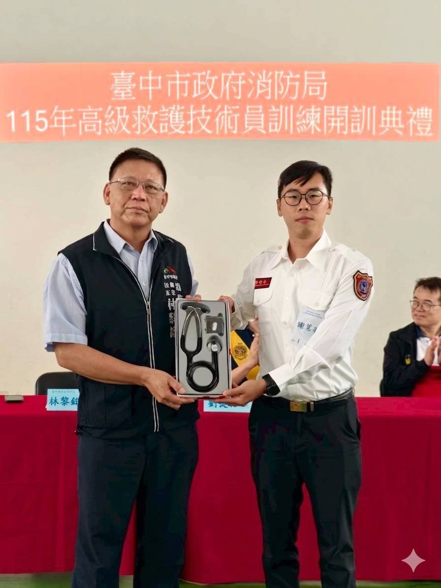 市府消防局表示,開訓典禮中特別安排了深具意義的傳承儀式。由林簡任技正與114年(TP7)高級救護技術員學員長,分別將象徵拯救生命重責大任的「聽診器」,以及代表專業知識傳承的「EMT-P教科書」,授予本期訓練學員代表。此舉不僅象徵責任的承擔與專業精神的延續,隨後更由犁份分隊謝茗羽擔任本屆學員代表,請全體參訓學員起立,共同朗讀EMT-P教科書首頁的誓詞進行莊嚴宣誓,齊心展現投入救護專業與守護生命的堅定決心。