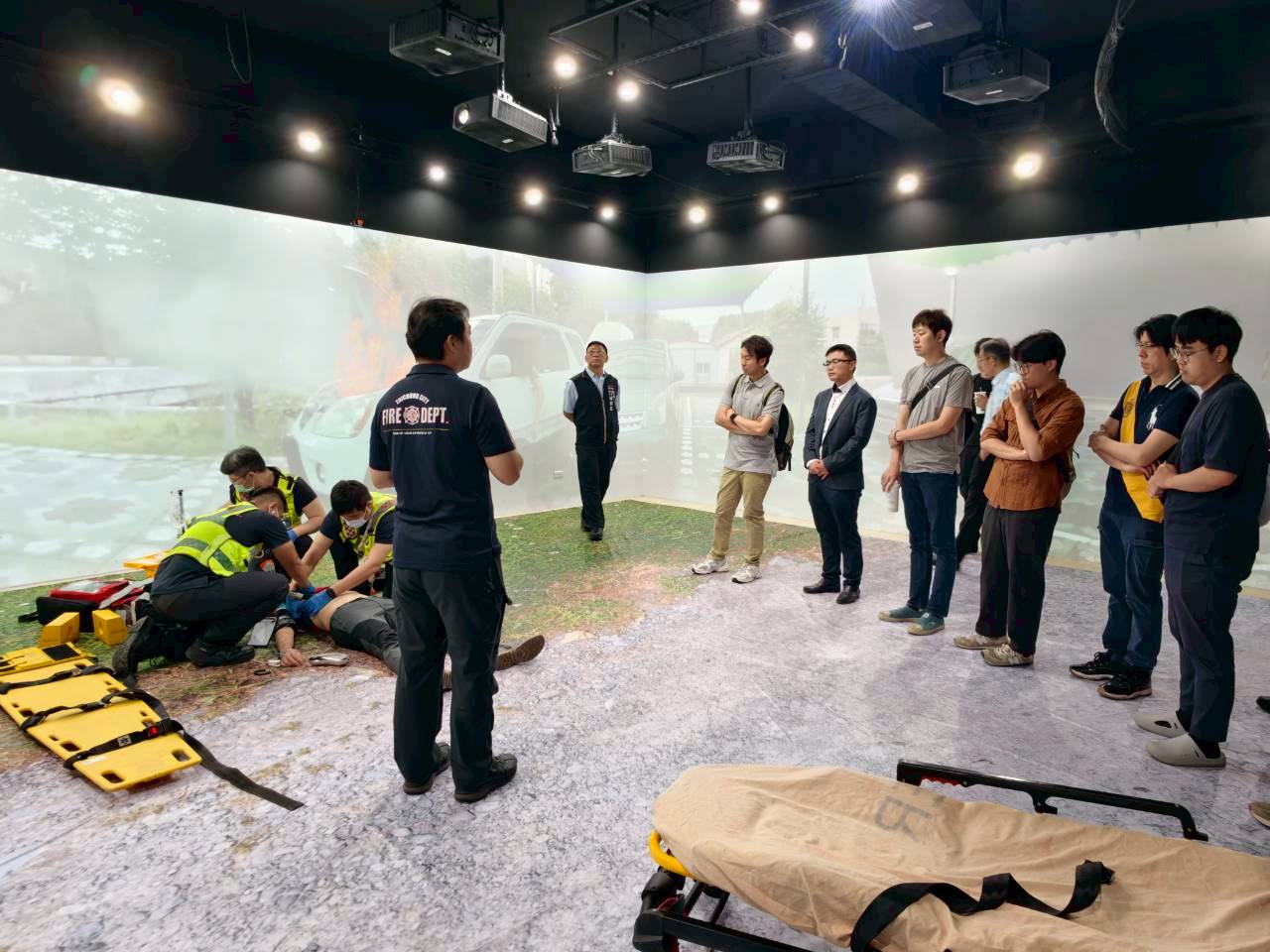 消防局進一步表示,宣誓儀式結束後,與會長官及貴賓移步至豐原訓練中心3樓情境模擬教室觀摩示範演練。此次演練由前一期學員長偕同葫蘆墩、赫力、博館高級救護隊成員共同執行,模擬嚴重車禍創傷且車體冒煙起火的危急情境。救護人員不僅迅速將受困駕駛脫困,更現場聯繫醫療指導醫師施宏謀主任,進行線上醫療指導並給予針刺減壓處置;逼真的實境演練不僅展現出沉浸式訓練的成效,也完美呈現出高級救護技術員在臨場判斷與應急處置上的優異素質。