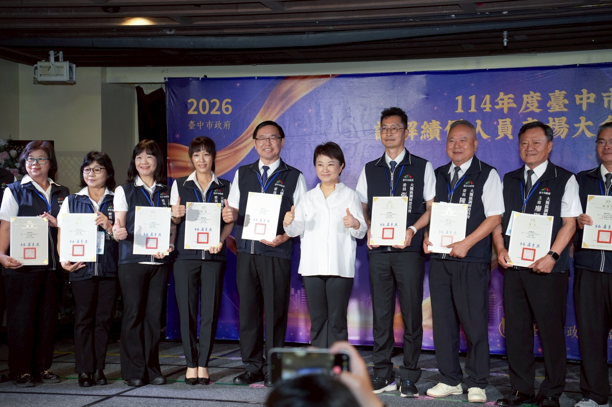 台中市政府於今(22)日在金典國際酒店舉辦「114年度調解績優人員表揚大會」,市長盧秀燕親自頒獎表揚調解績優有功人員,並代表台中市政府向全體調解人員協助排解民眾紛爭的貢獻表達感謝之意,正因地方團隊的長期耕耘及法制局積極推動,使台中市調解成立率自108年起至今皆高居全國第一。