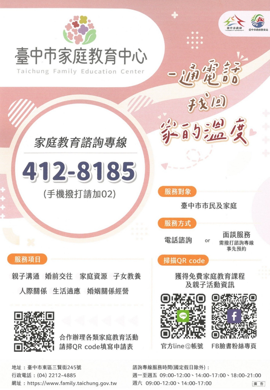 詳情請持續關注「台中市家庭教育中心」臉書粉絲專頁( https://share.google/OeCvnndUJtvnnAHFK )及LINE官方帳號( https://reurl.cc/3KGlOX ),掌握最新相關資訊。(4/23*10)*教育局
