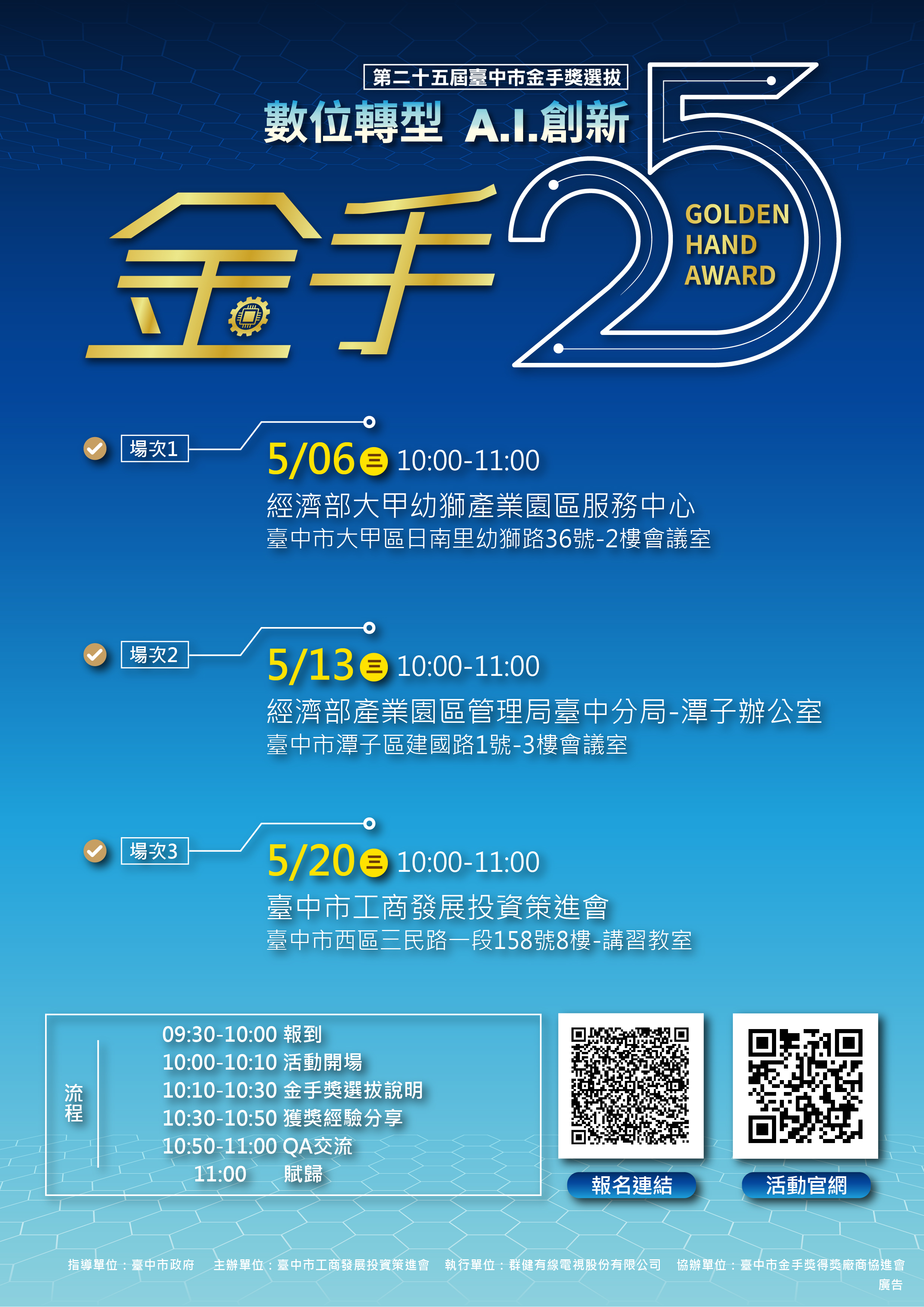 「第25屆台中市金手獎」即日起受理報名至6月15日止!台中市工商發展投資策進會誠摯邀請符合資格的在地中小企業製造業踴躍參與,在延續「黑手變金手」產業精神的同時,展現導入AI科技、推動智慧製造升級的轉型成果。