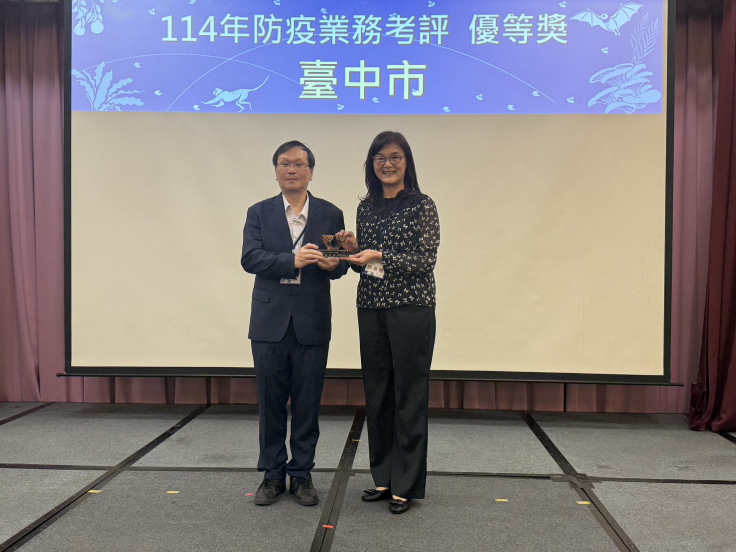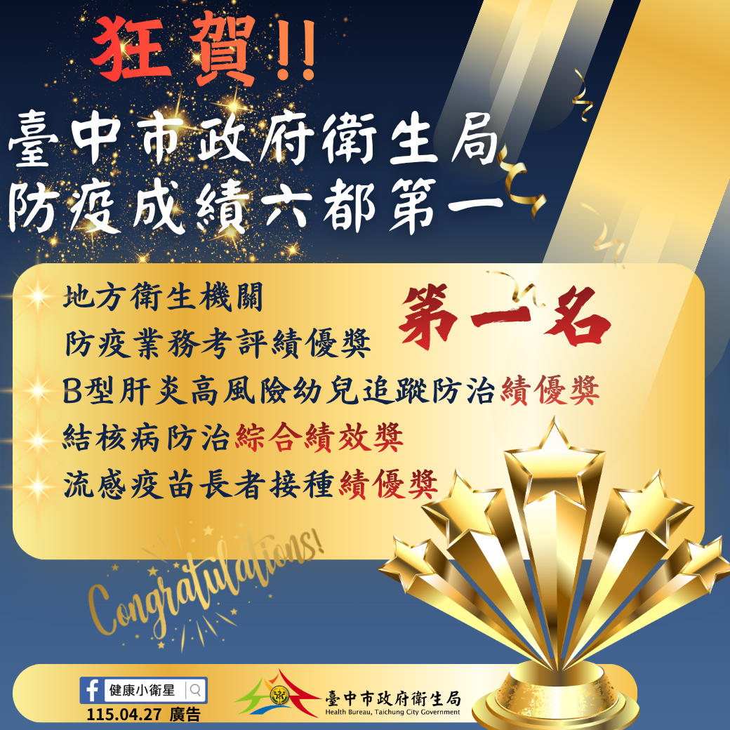 衛生福利部疾病管制署今(27)日舉辦「115年全國防疫業務聯繫會議」,公開表揚各縣市114年度防疫執行成效。台中市政府衛生局表現亮眼,在第一組縣市中脫穎而出,榮獲「地方衛生機關防疫業務考評績優獎」第一名,並同時拿下「B型肝炎高風險幼兒追蹤防治績優獎」、「結核病防治綜合績效獎」及「流感疫苗長者接種績優獎」等四大獎項,展現台中穩健防疫實力。
