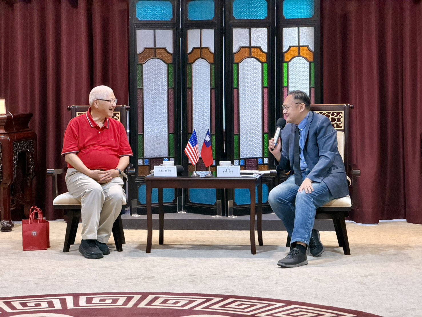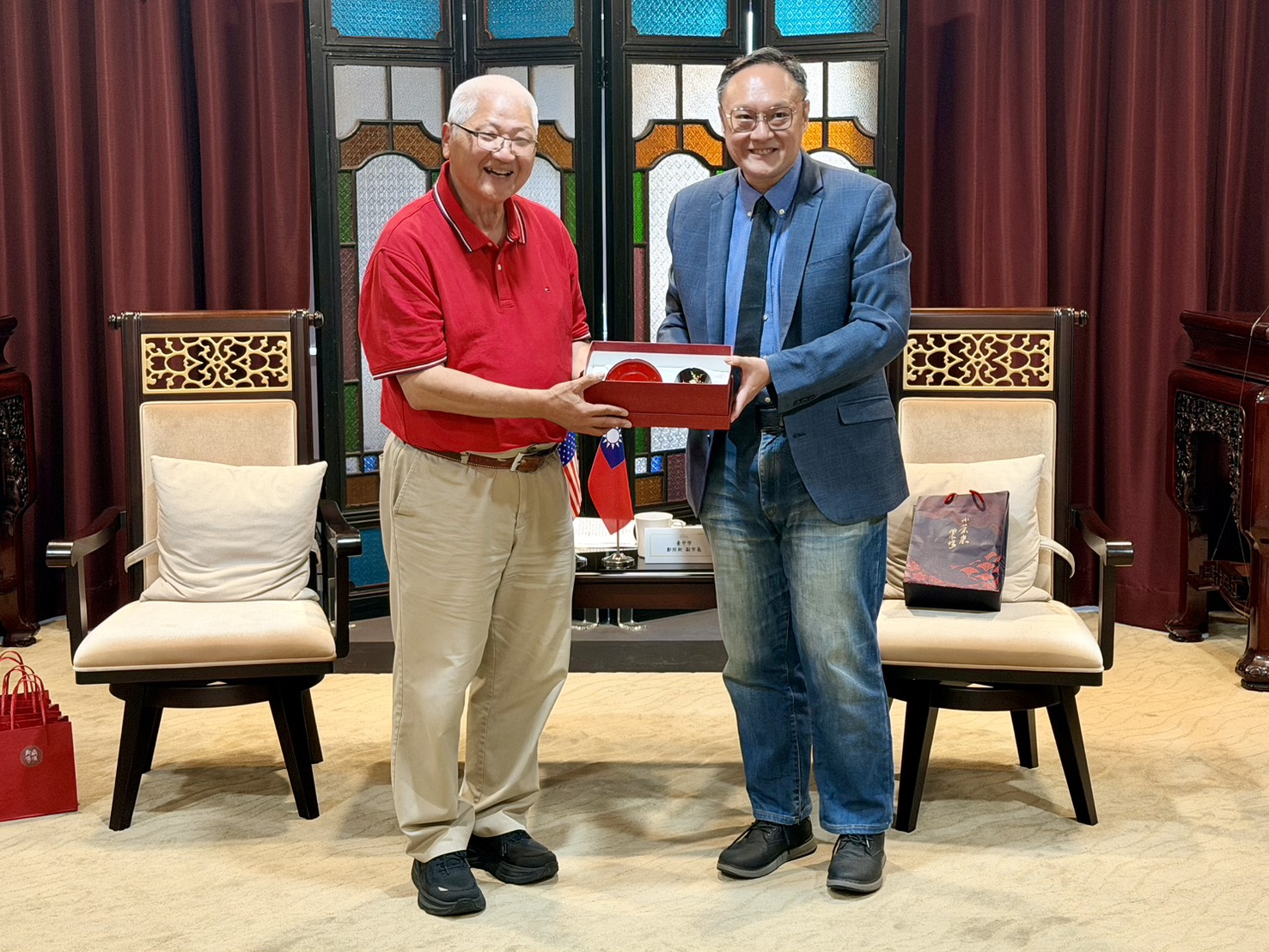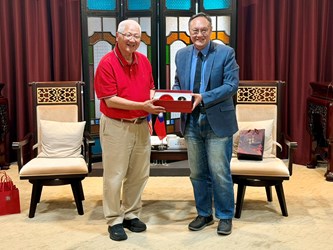 會談氣氛溫馨熱絡,數位發展局長林谷隆、新聞局長欒治誼及秘書處長謝佳蓁亦出席與會。鄭副市長代表市府致贈結合台中地標湖心亭意象的「漆藝杯盤組」,以及霧峰農會「檸檬蜂蜜酒」作為伴手禮,陳顧問一行也對台中熱情的接待表達由衷感謝。(4/28*15)*秘書處