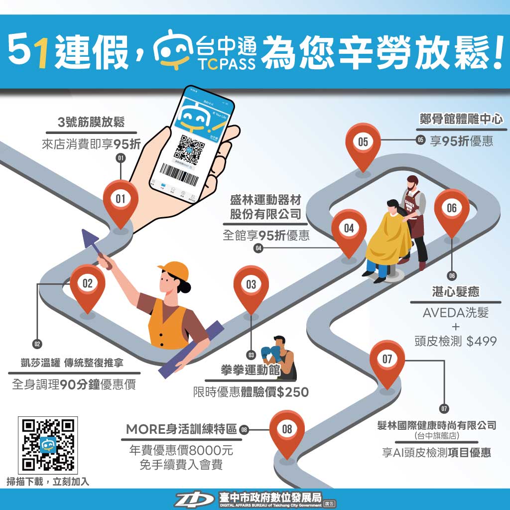 台中通為您辛勞放鬆!51勞動節連假將至,台中市政府數位局特別透過《台中通》APP精選多項紓壓好康,策劃「51連假放鬆提案」,涵蓋身體調理、運動釋放與頭皮療癒等多元面向,邀請市民朋友在連假期間暫時放下工作壓力,放慢步調走進特約店家,利用好康優惠好好放鬆一下。