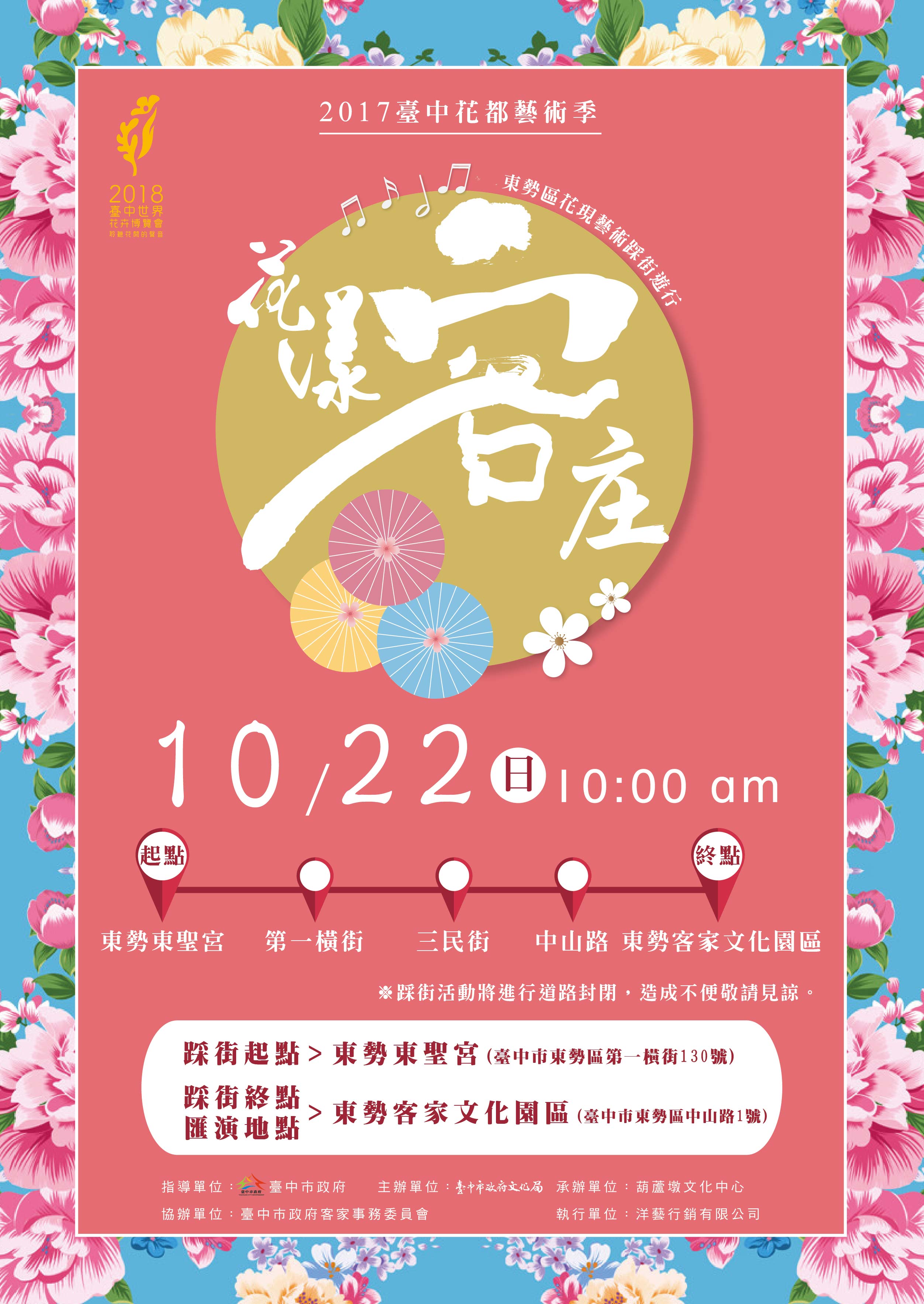 東勢區花現藝術踩街遊行活動以「花漾客庄」為主題,邀請音樂、舞蹈及傳統雜藝等多樣類型的山城在地優秀表演團隊及學校社團共12團隊參與遊行,並結合在地客庄文化、山城在地產業特色好康禮大fun送,推動跨領域交流讓民眾更加認識大臺中的文化藝術表演者及在地特色產業,拉近藝術與民眾的距離,與整個城市一起舞動,體驗本市創新多元、歡樂繽紛的文化氛圍。