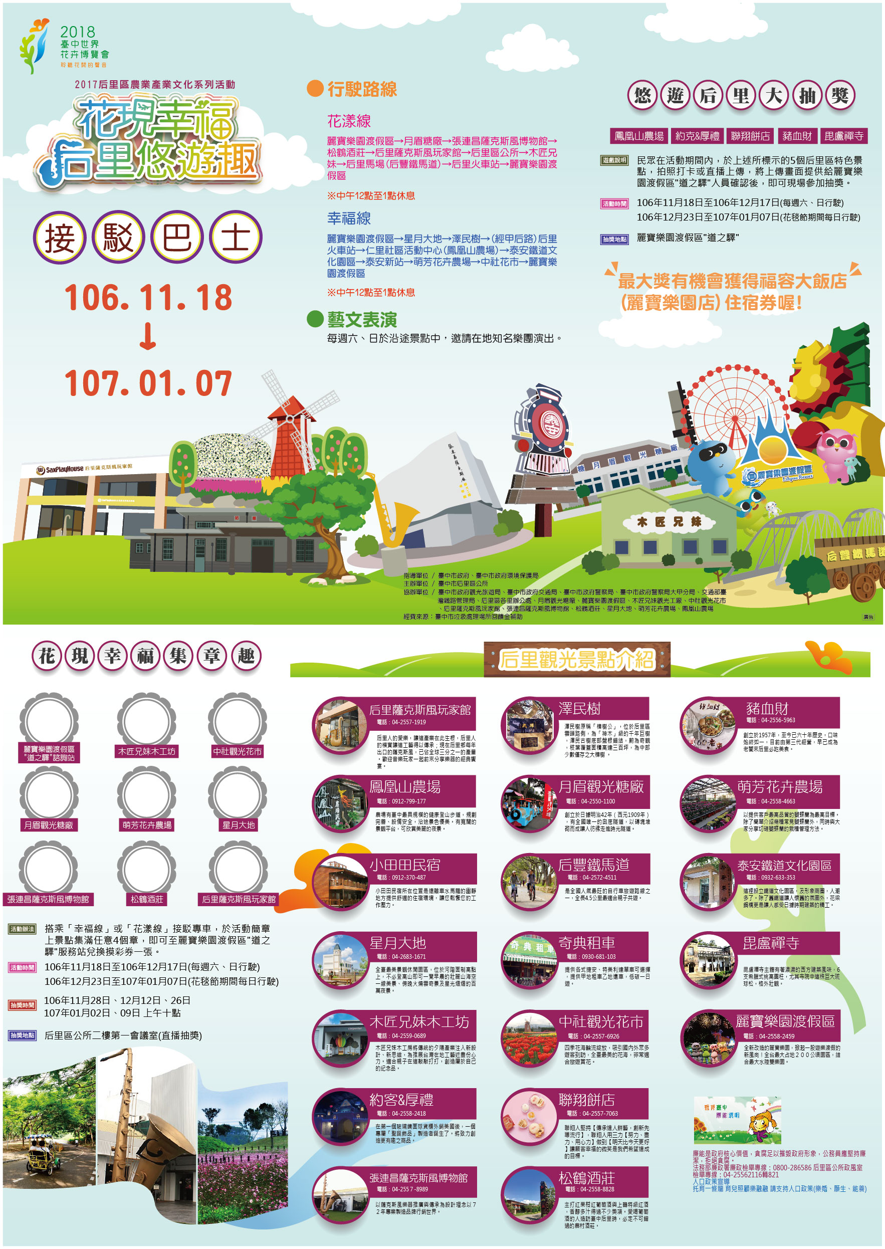 「花現幸福 后里悠遊趣」將於106年11月18日至107年1月7日隆重登場,歡迎蒞臨后里區。