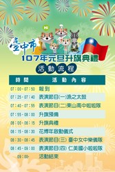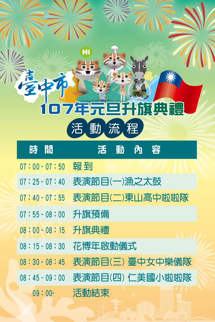 2018年是臺中市透過花博迎向世界的一年,因此臺中市政府特別邀請了8位新住民及原住民代表領唱、贈送限量版花博運動毛巾,由市長啟動花博年儀式,象徵臺中走向世界,而世界也與臺中融合,突顯臺中躍升第二大城,以及兼具國際級宜居城市之榮耀及生命力。 107年1月1日(星期一)上午7時起,臺中市政府在臺灣大道市政大樓府前廣場舉辦「臺中市各界慶祝中華民國107年元旦升旗典禮」活動,7時起發送限量版3,500條花博運動毛巾,送完為止,歡迎市民朋友踴躍共襄盛舉,一同迎接花博年的到來。 民政局周永鴻局長表示,除了展現臺中多元民族文化的融合力,也邀請蟬聯14年冠軍的臺中市立東山高中啦啦隊、具55年歷史的臺中女中樂儀旗隊及剛成軍不到半年即獲得雙料冠軍的仁美國小啦啦隊,還有極具地方特色的臺中魚市場的太鼓開場,當然,還有代表2018臺中世界花博的吉祥物-石虎家族也會一起到場與大家同樂,節目豐富,精彩可期。 |