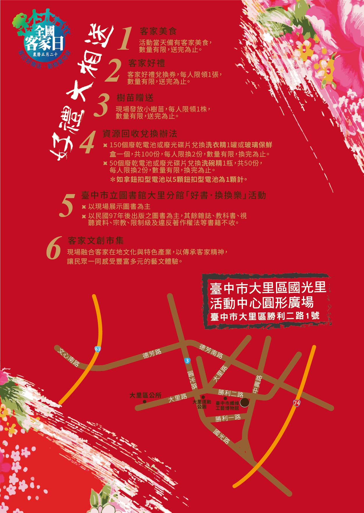 一、活動時間:107年3月10日上午9時30分至12時 二、活動地點:臺中市大里區國光里活動中心圓形廣場(勝路二路1號) 三、活動安排阿比百樂團、青年高中舞蹈科、臺中市大屯客家藝術團及本市社團、學校參與演出,同時結合二手書交換、資源回收兌換、大家來說客語與文創市集等活動攤位,節目內容豐富、精彩;同時為宣導2018臺中世界花卉博覽會,辦理樹苗贈送活動。 四、另活動現場發放客家好禮兌換券,會後每人憑1券兌換1份客家好禮,數量有限送完為止;並備有客家美食,歡迎各位市民來品嚐客家美食,欣賞客家藝文表演。 五、參加民眾可搭乘公車至「纖維博物館(中興路)」或鄰近的站牌下車後,步行至活動會場,公車站牌資訊如下: (一)大里運動公園(國光路-勝利二路):50 (二)纖維博物館(中興路):53、107、108、158、201、285 (三)纖維博物館(勝利二路):132 |