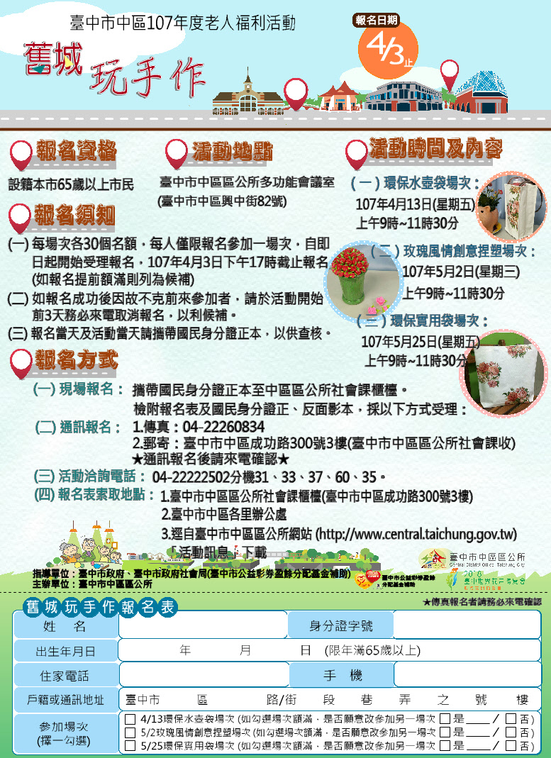 有關本(107)年度老人福利活動之報名方式,說明如下: 1.報名表索取地點: (1)臺中市中區區公所社會課櫃檯(臺中市中區成功路300號3樓)。 (2)臺中市中區各里辦公處。 (3)逕自臺中市中區區公所網站(http://www.central.taichung.gov.tw)「活動訊息」下載後,傳真(04-22260834)或郵寄(臺中市中區成功路300號3樓,臺中市中區區公所社會課收,以郵戳日期為憑)。 2.活動洽詢電話:04-22222502分機31、33、37、60、35。 3.傳真或郵寄報名後請來電確認。 4.詳細報名資格及限制請詳閱報名表(附件)。 |