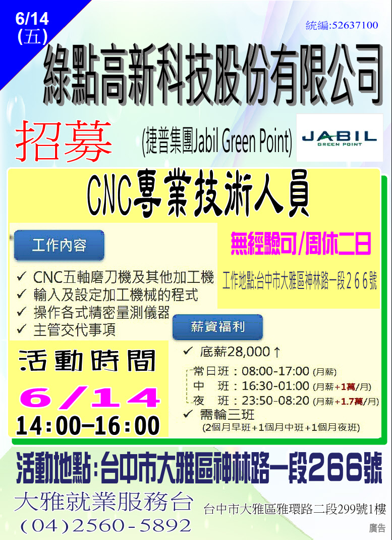 職 缺: CNC機械加工技術人員(10名)