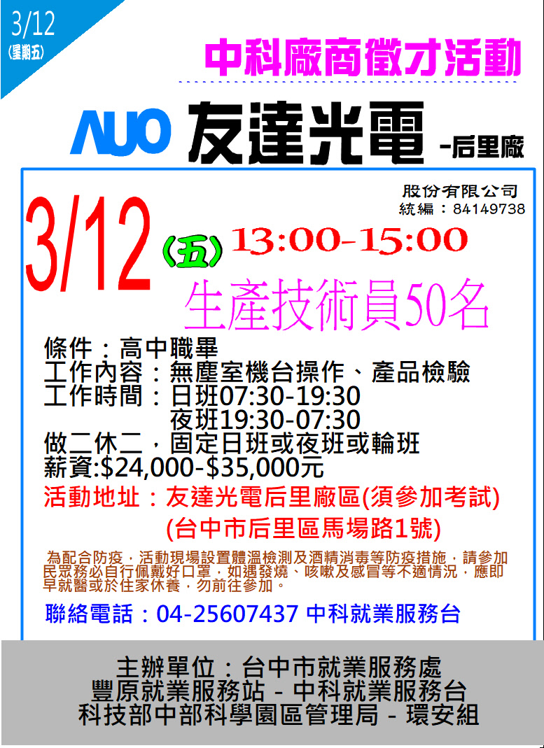 活動地點:友達光電股份有限公司-后里廠(臺中市后里區馬場路1號)