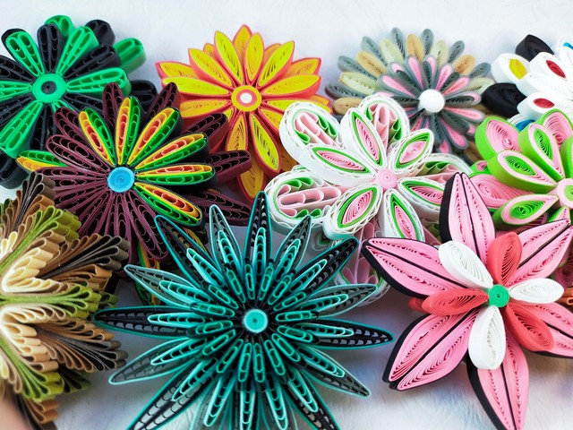捲紙藝術(Quilling, paper quilling),又稱衍紙,是介於平面與立體之間的藝術形式。透過將紙張仔細切割、捲繞、摺疊的方式,搭配組合成圖案打造出一幅充滿活力的立體紙藝作品,此次紀榮玲老師以花、蝴蝶為主軸分別以吊飾、團扇、掛畫等形式的創作,顏色鮮明,平面立體捲紙相互運用交錯出有趣的畫面。