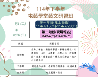 屯區藝文中心114年下半年「屯藝學堂-藝文研習班」,課程包含—花鳥工筆畫-初級班、動植物彩墨創作、創意手作皮雕、彩繪牡丹花卉班、彩墨創作、烏克麗麗、樂活畫水彩、水墨畫創作、水墨山水、毛筆製作、竹笛快樂頌、右軍書法班、玻璃嵌畫、輕鬆學油畫、花鳥蔬果草蟲班、遊藝書法研習、壓克力彩繪畫等課程,活動將於114年7月中旬開放線上報名,歡迎有興趣的民眾踴躍報名參加。