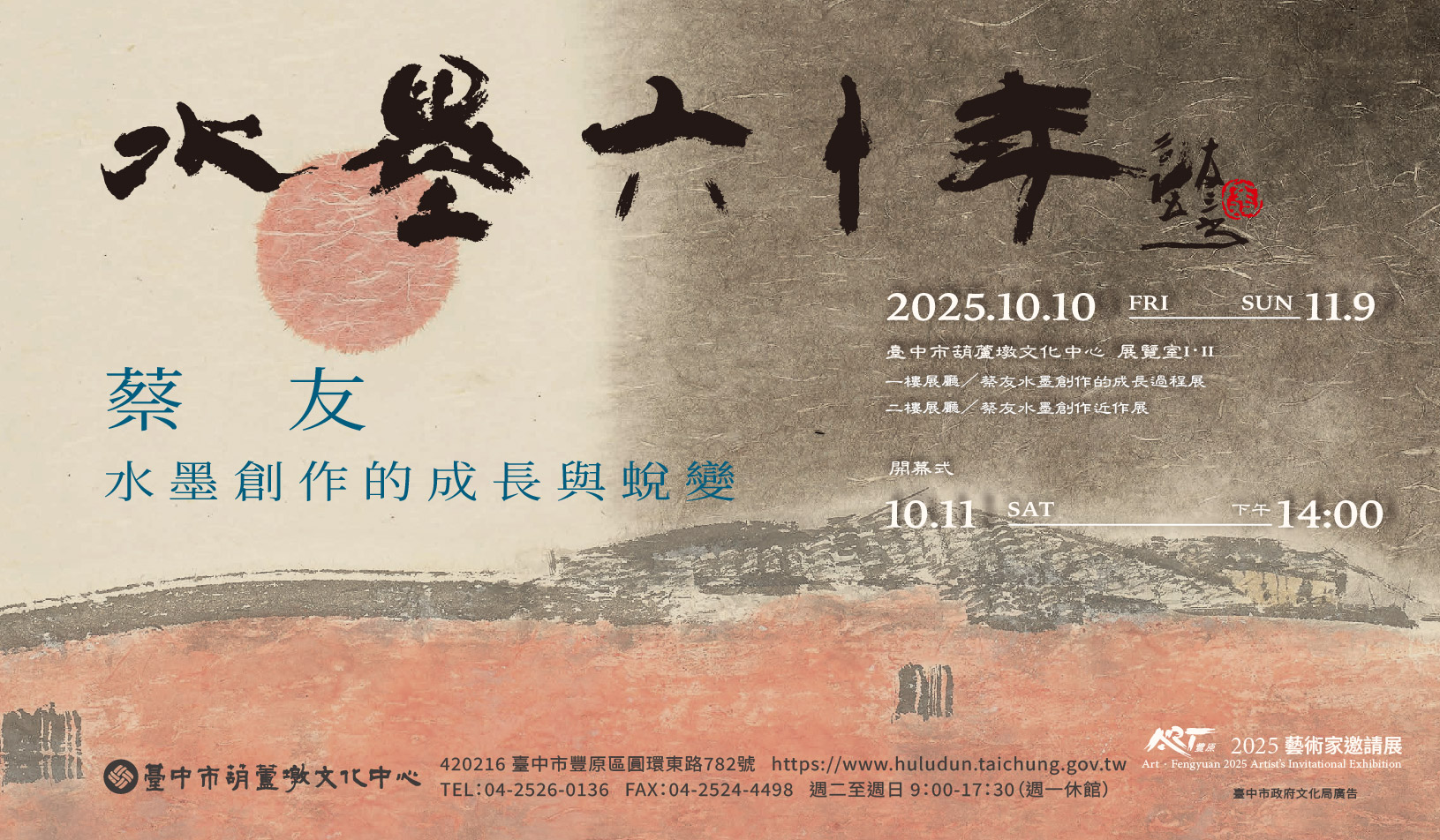 「ART.豐原藝術家邀請展」由臺中市政府文化局自2016年辦理至今已邁入第10年,每年展出資深前輩藝術家作品,透過其深厚的人生歷練與藝術能量,帶給社會大眾更多關於美的體悟。2025年邀請前國立臺灣藝術大學書畫學系主任蔡友老師,以「水墨六十年-蔡友水墨創作的成長與蛻變」為題,完整呈現蓄積多年的創作成果,帶領觀者走進筆墨流轉的藝術世界。