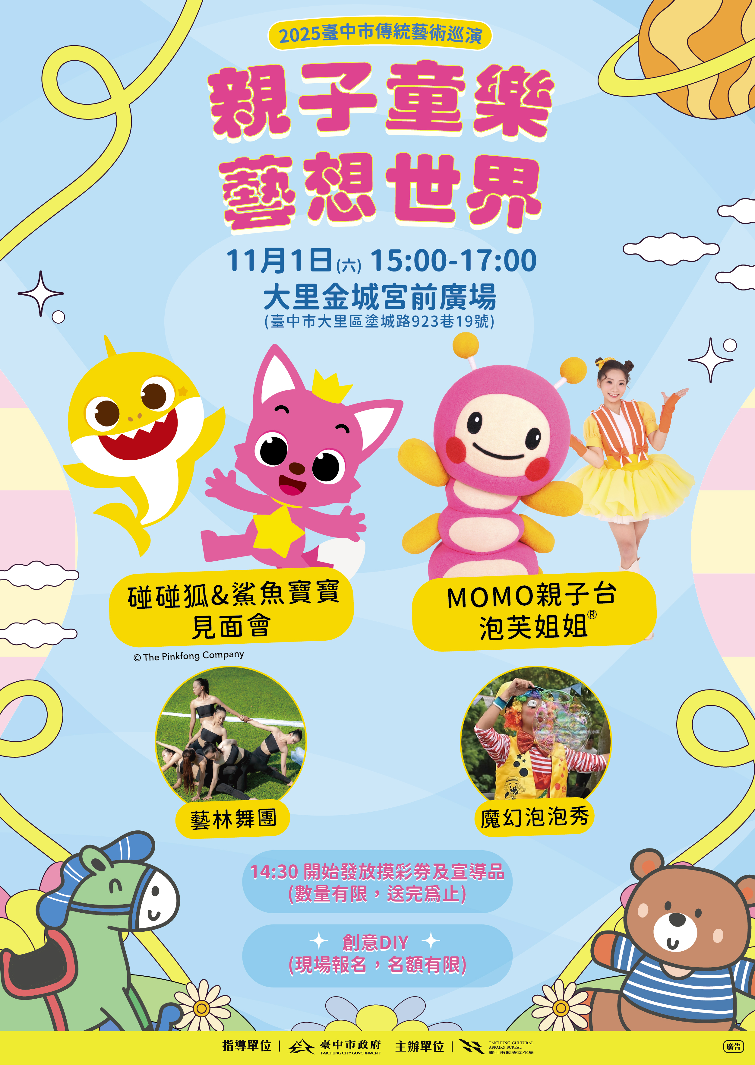 為推廣傳統藝術之美,延續民間文化精神,臺中市政府文化局將於11月1日(六)下午15時在大里金城宮前廣場舉辦「2025臺中市傳統藝術巡演—親子童樂 藝想世界」,邀請大小朋友一同走進傳統藝術的奇幻世界,感受藝文魅力。
