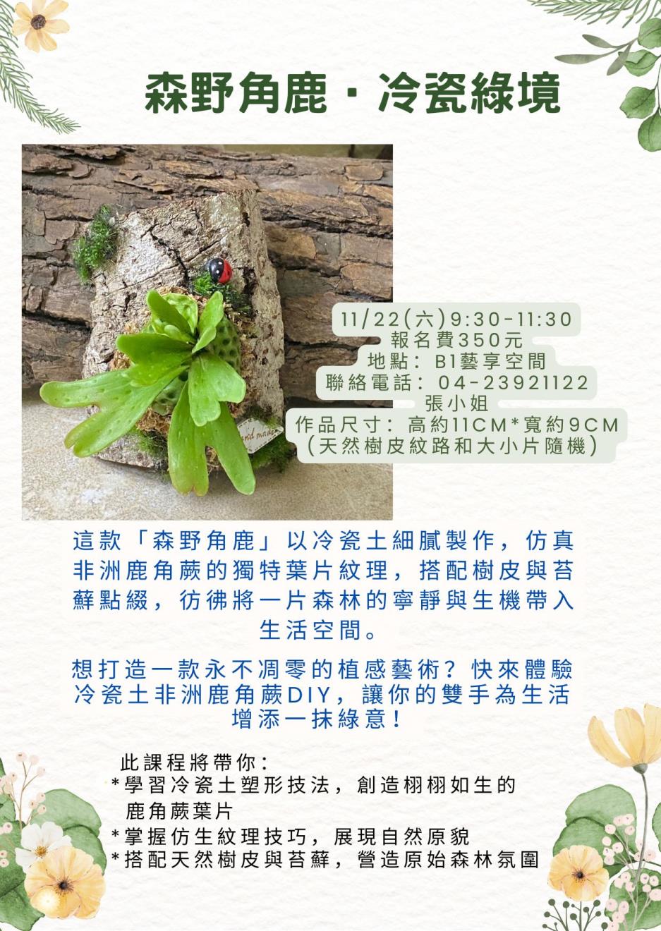 想打造一款永不凋零的植感藝術?快來體驗冷瓷土非洲鹿角蕨DIY,讓你的雙手為生活增添一抹綠意!