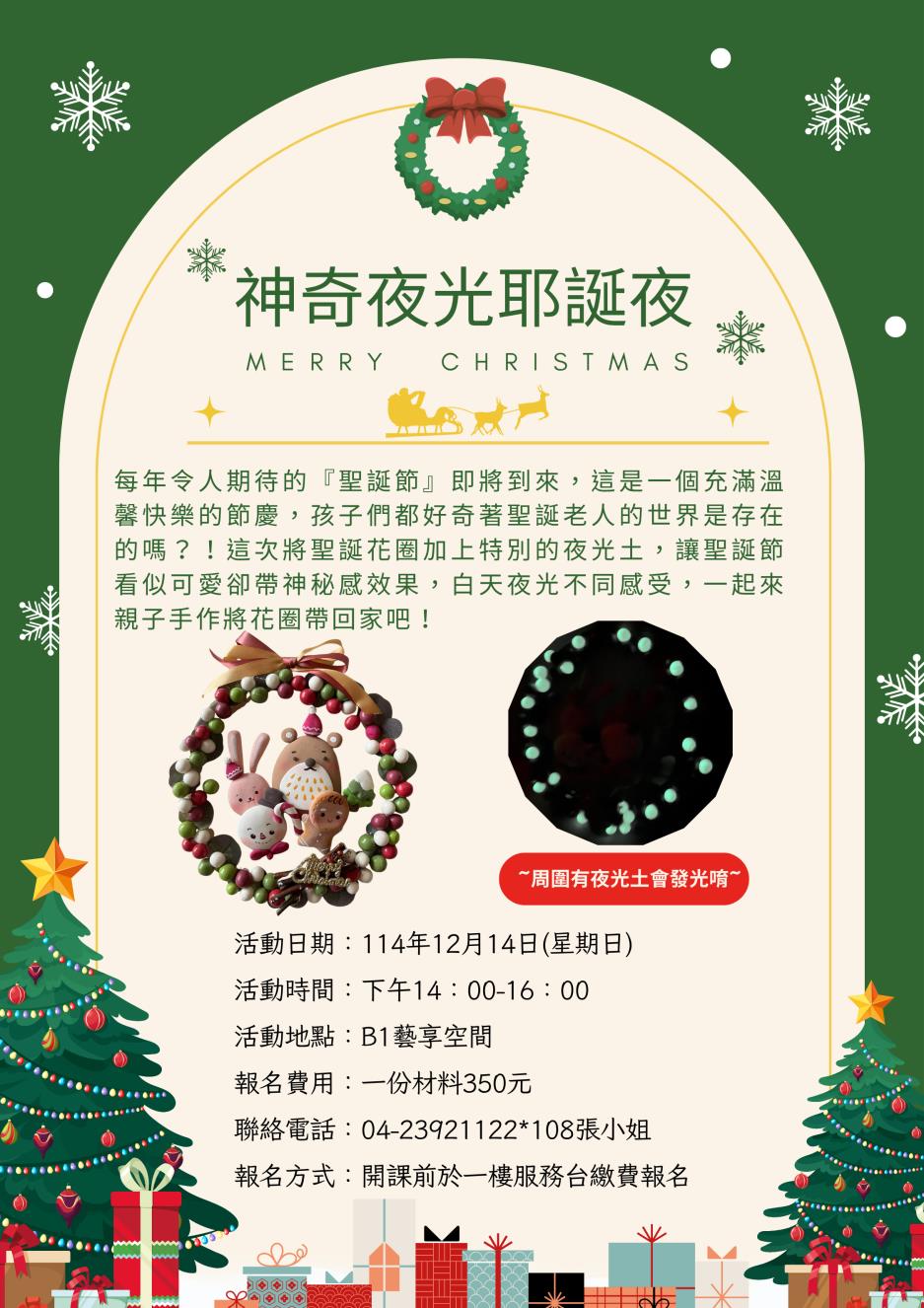 每年令人期待的『聖誕節』即將到來,這是一個充滿溫馨快樂的節慶,孩子們都好奇著聖誕老人的世界是存在的嗎?!這次將聖誕花圈加上特別的夜光土,讓聖誕節看似可愛卻帶神秘感效果,白天夜光不同感受,一起來親子手作將花圈帶回家吧!