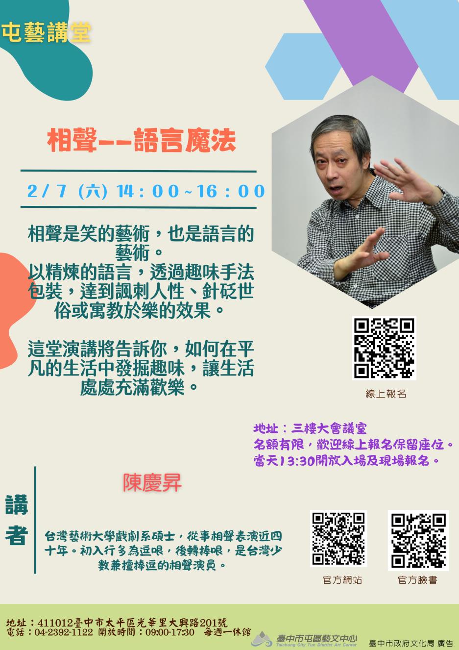 這堂相聲主題講座以「笑」與「語言」為核心,帶領大家認識相聲如何以精煉的語句與巧妙的包裝,呈現幽默、諷刺與生活智慧。講師將分享相聲中的語言技巧、日常觀察及創作心法,讓參與者學會在平凡生活中發現趣味,用幽默看世界,讓每一天都更輕鬆、更有滋味。