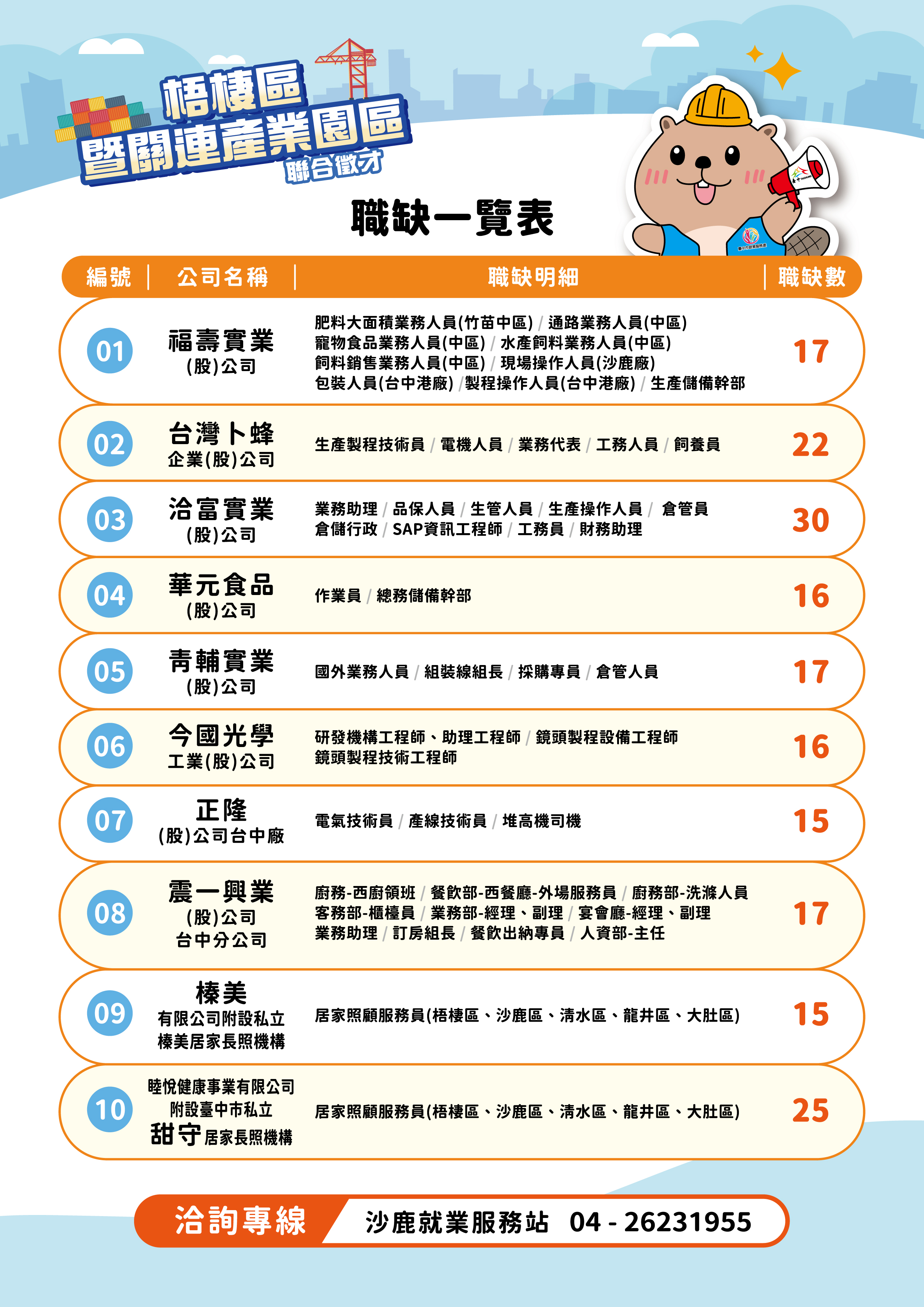 - 活動內容:邀請福壽實業、台灣卜蜂、洽富實業、華元食品、青輔實業、今國光學、正隆台中廠、震一興業、榛美居家及甜守居家等10家廠商,共190個工作機會,歡迎市民踴躍參與!