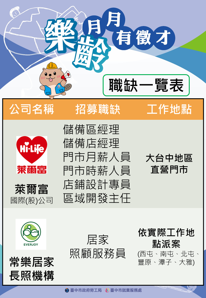 邀請萊爾富、常樂居家共2家廠商,提供97個職缺,歡迎求職民眾踴躍參加。