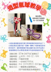 你一定看過街頭藝人用長長的氣球做出可愛動物或花朵的表演吧!?小朋友最喜歡這個可愛又帶來歡樂的氣球作品了!小朋友想自已動手捏一捏轉一轉嗎?老師會告訴你好多技巧,讓你輕鬆動手做出屬於自己的作品哦!爸爸媽媽也可以學習2款拿手作品來送給孩子哦!