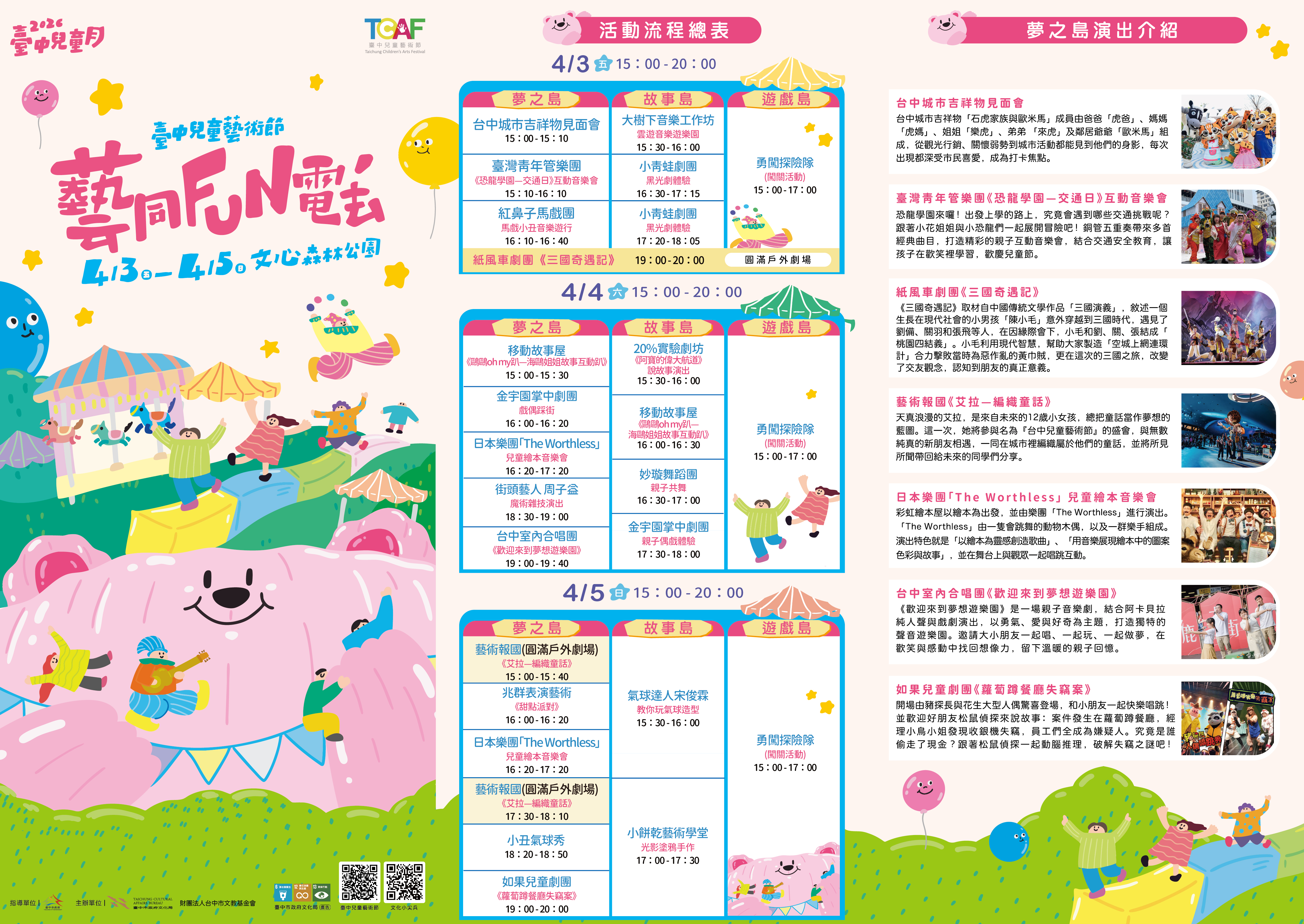值得期待的是,今年首度將「全國兒童聯想創作畫比賽」的得獎作品融入活動現場佈置,孩子們天馬行空的筆觸,將成為藝術節最絢爛的妝點。除了公園的歡聚,4 月份的週末,也在藝文場館同步規劃多場精緻演出,邀請孩子走進劇場,深度體驗沉浸式的藝術魅力。