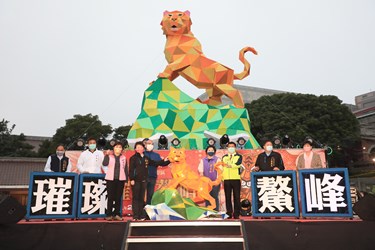 盧市長表示,今年台中市擴大辦理元宵燈會,共兩個燈區,一是清水港區藝術中心燈區,另一是明晚將開幕的文心森林公園燈區,兩燈區都展至2月20日止;清水燈區以「璀璨鰲峰」為主題精心策劃,栩栩如生的福虎立於鰲峰山四面臨海,威風凜凜遠眺大台中,呈現台中山海屯盛事之景,搭配8大主題燈區,充分展現清水豐富的自然環境生態及熱情的人文魅力,沉浸式的彩燈世界,將成為打卡新亮點。