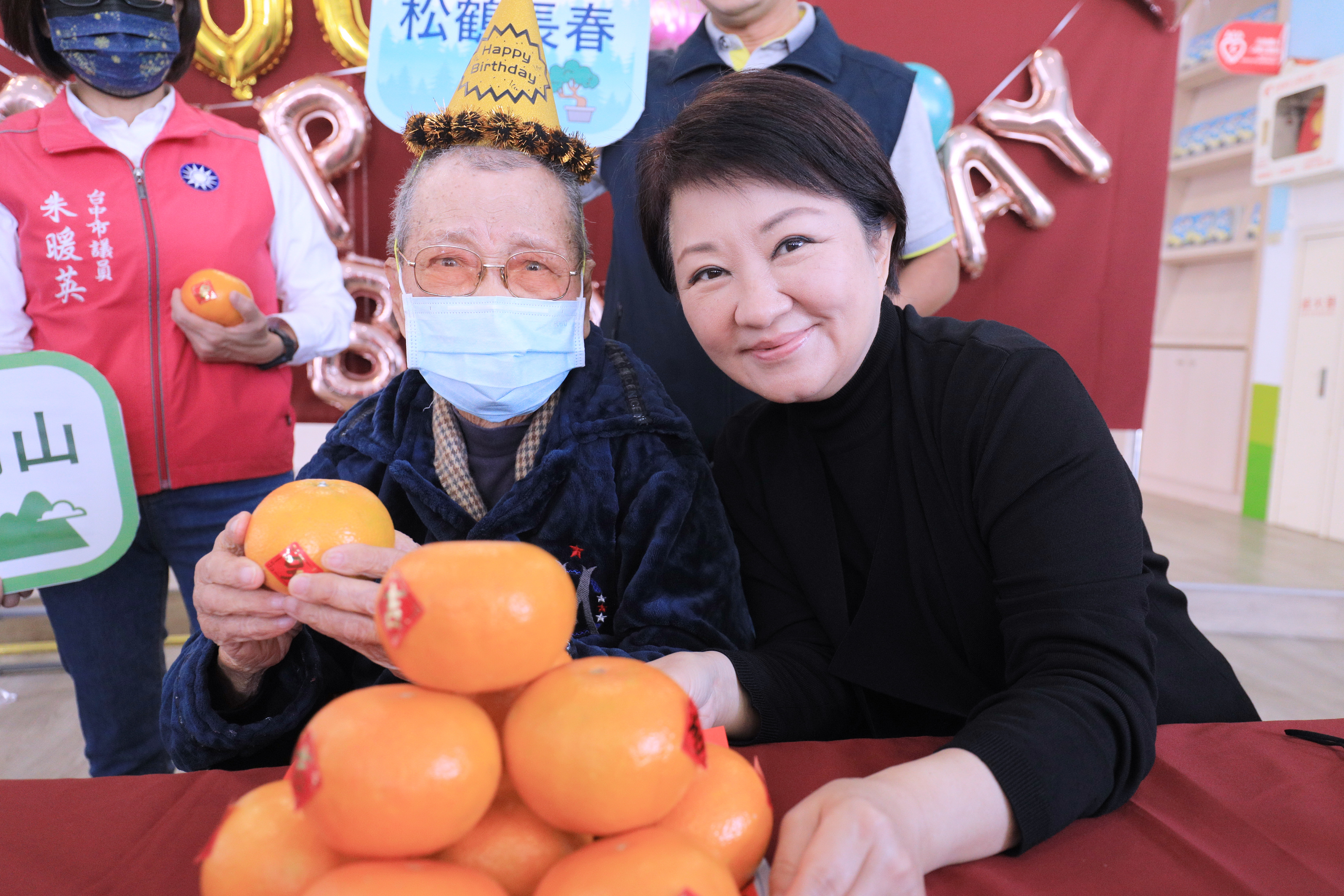 今日慶生會上,盧市長、市議員劉士州、朱暖英、文化局長陳佳君、南屯區長林秋萬、春安里長閻新懃、春安國小校長陳貞蓉、警察局第四分局長許明耀等人都到場為彩虹爺爺唱《生日快樂歌》;盧市長也代表市府致贈福壽安康金牌及雞精,期盼黃爺爺繼續開心作畫,平安健康。黃爺爺則發送橘子給出席來賓,祝福大家新年大吉大利!