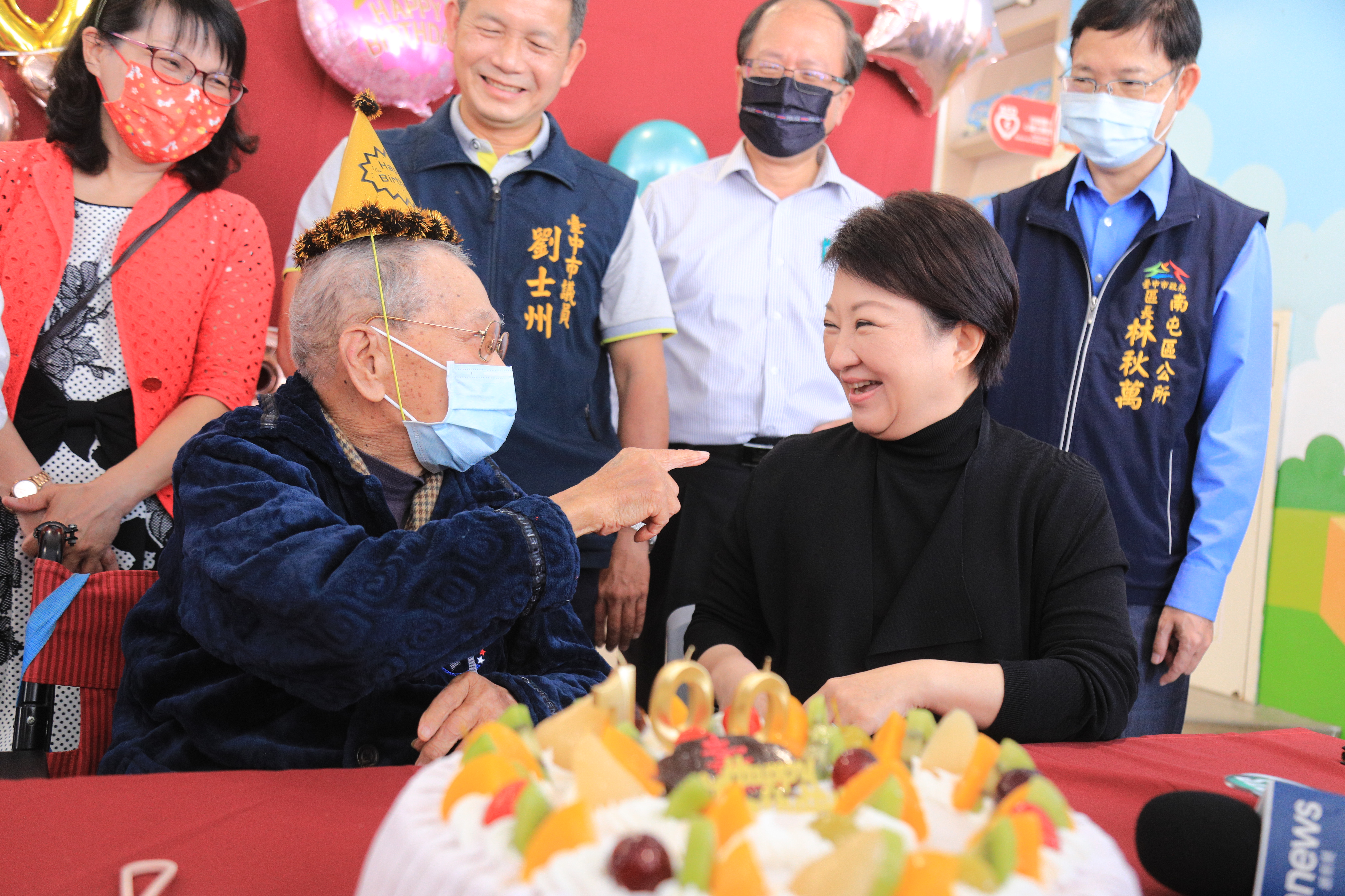 台中市長盧秀燕今(14)日拜訪彩虹爺爺黃永阜先生,祝賀黃爺爺一百歲生日快樂!盧市長看見黃爺爺身體健康非常高興,她說,黃爺爺是榮譽市民,1月16日是他百歲生日,市府今日特別幫黃爺爺過壽,祝福他松柏長青、身體健康;很高興看到黃爺爺在家人及退輔會照顧下,耳清目明、思緒清晰,飲食及生活相當正常。黃爺爺也許下生日願望,希望至少活到120歲,再跟大家一起過生日!