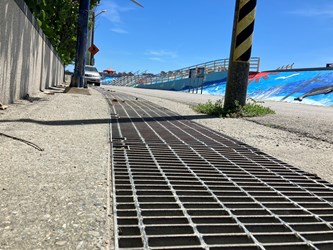 陳局長進一步說明,此次改善範圍,包含堤頂步道利用濕式紙模舖面及噴色處理,不再以單調混凝土呈現,使舖面更加美觀及安全;休憩廊道梁柱將剝落、鬆動的混凝土敲除至堅硬面,遇到鋼筋則塗佈環氧樹脂後再加以灌漿,使廊道耐久度提升;排水溝則以人工清淤至北汕溪出海口,每5公尺設置3組熱浸鍍鋅隔柵板水溝蓋,未來可方便清潔。