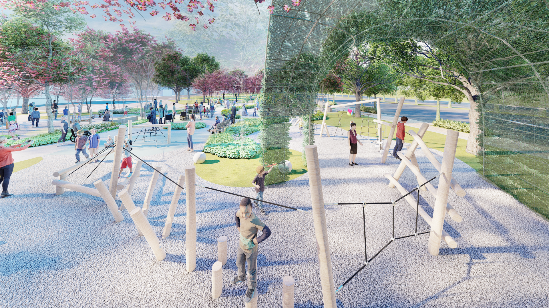 建設局表示,此次共融公園統包工程以「自然遊戲場」為主題,利用自然元素環繞遊戲空間,打造可多元攀爬的挑戰型主體遊具,包含攀爬滑梯、共融式鞦韆(5種類型)、攀爬挑戰等,並透過環形動線串連全區遊戲體驗,讓孩童在大自然中遊戲與學習。另體健設施也重新檢討無障礙動線,並將既有看台再利用,設置於蔭涼區,讓照護者及輪椅族有休憩空間,創造親子共玩場域。