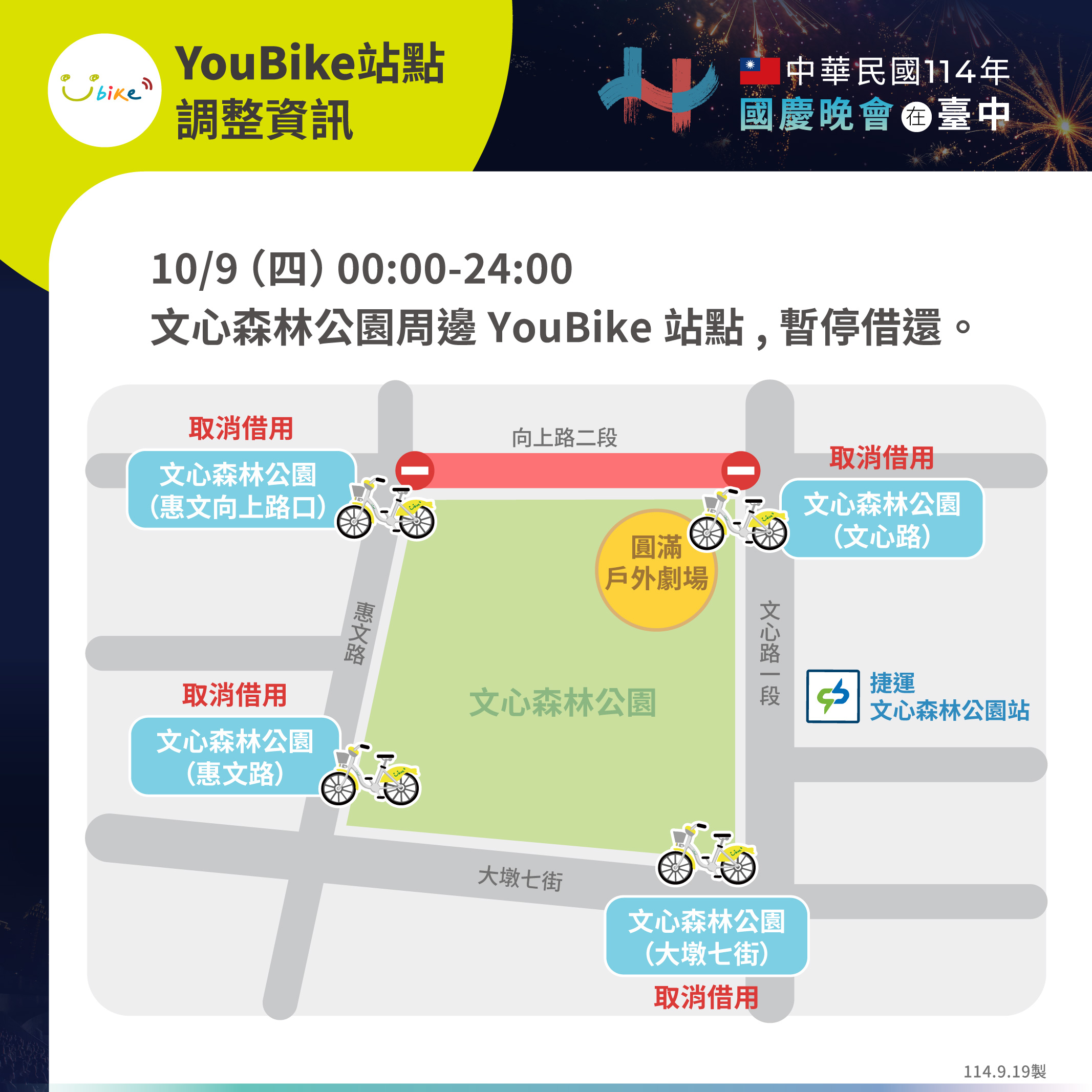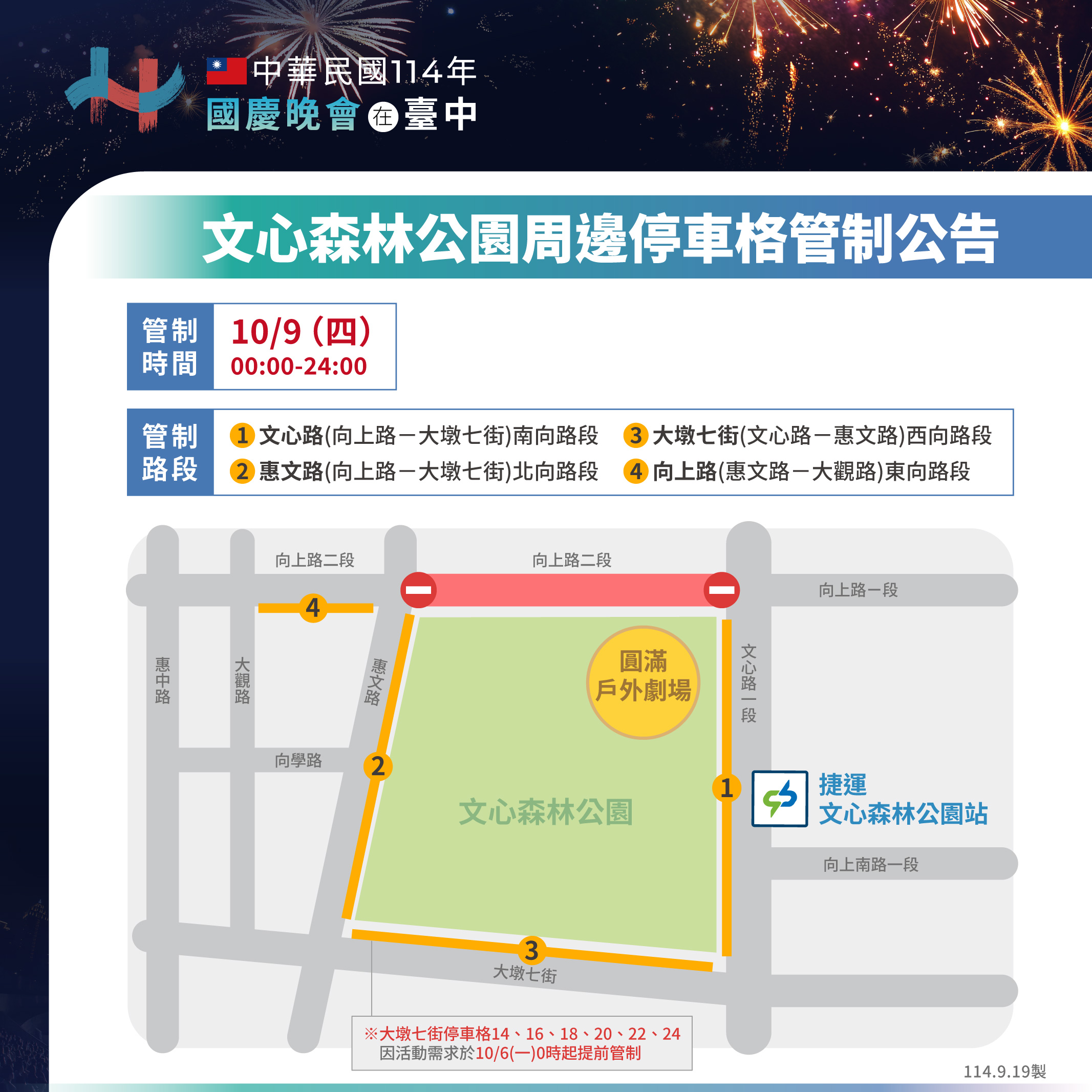 觀旅局補充,為減少交通壅塞情形,鼓勵民眾搭乘捷運、公車、台鐵、高鐵等大眾運輸到晚會現場,10月9日下午2時起,向上路二段(文心路一段至惠文路)將進行雙向封閉,同時段「向上路與惠文路口」(文心森林公園側)公車站牌取消停靠,提醒民眾可至鄰近公車停靠站搭乘。另10月9日全日文心森林公園路邊停車格(含機車格)、惠文停車場、文心森林公園附設停車場(含機車停車區)實施淨空管制,公園內YouBike站點暫停借還,相關交通管制措施將於10月10日0時起全面恢復。
