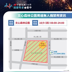 為維護晚會現場安全,當天上午8時至10月10日0時,文心森林公園全域禁飛無人機,圓滿戶外劇場入場前需接受安檢,禁止攜帶超過40*40*40公分的背包及自拍棒、腳架或長柄雨傘,除導盲犬外禁止攜帶動物入內。場內並禁止飲酒,飲料、水等液體需經試飲後才可帶入場,相關禁制物已於國慶晚會官網公告,提醒民眾入場前留意規定。