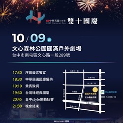 國慶晚會10月9日將於文心森林公園圓滿戶外劇場盛大登場!台中市政府觀光旅遊局表示,晚會以「中華民國」、「台灣味」、「台中Style」為三大主軸,齊聚超強卡司祝賀國家生日快樂,先以大場面、大編制為「中華民國」慶生,續以雙王雙后再現鑽石舞台秀展現道地的「台灣味」,最後以在地新聲代混搭嘻哈大天團的「台中Style」嗨翻全場,邀請全體國人同歡,並肩前行開創新局面。