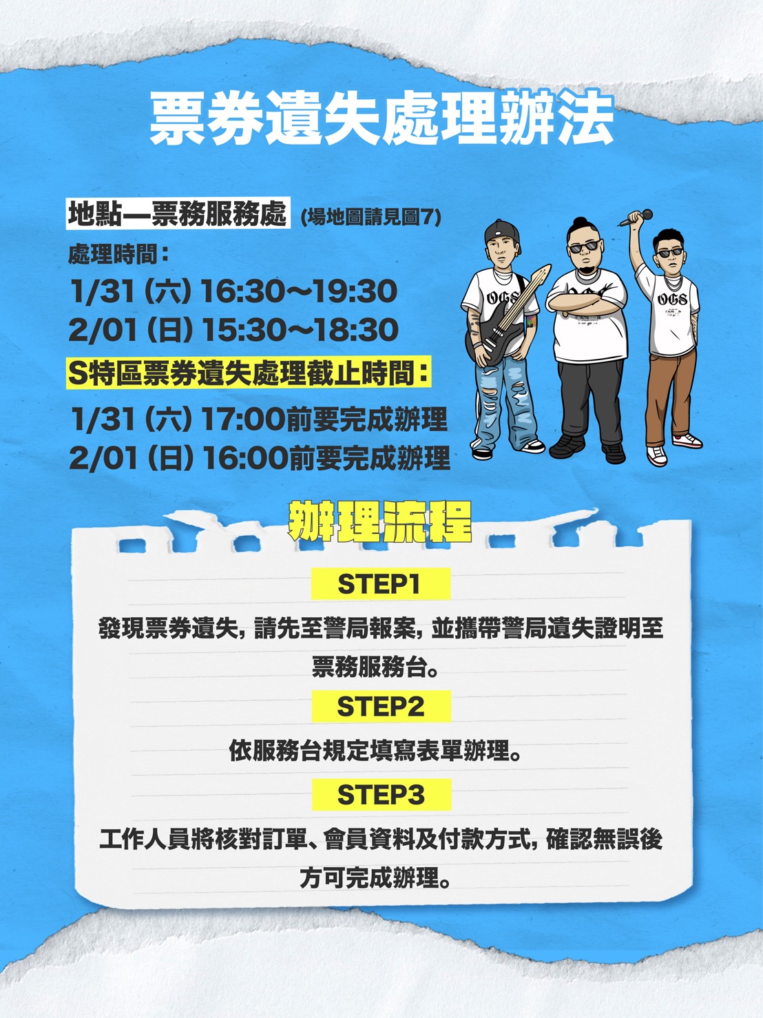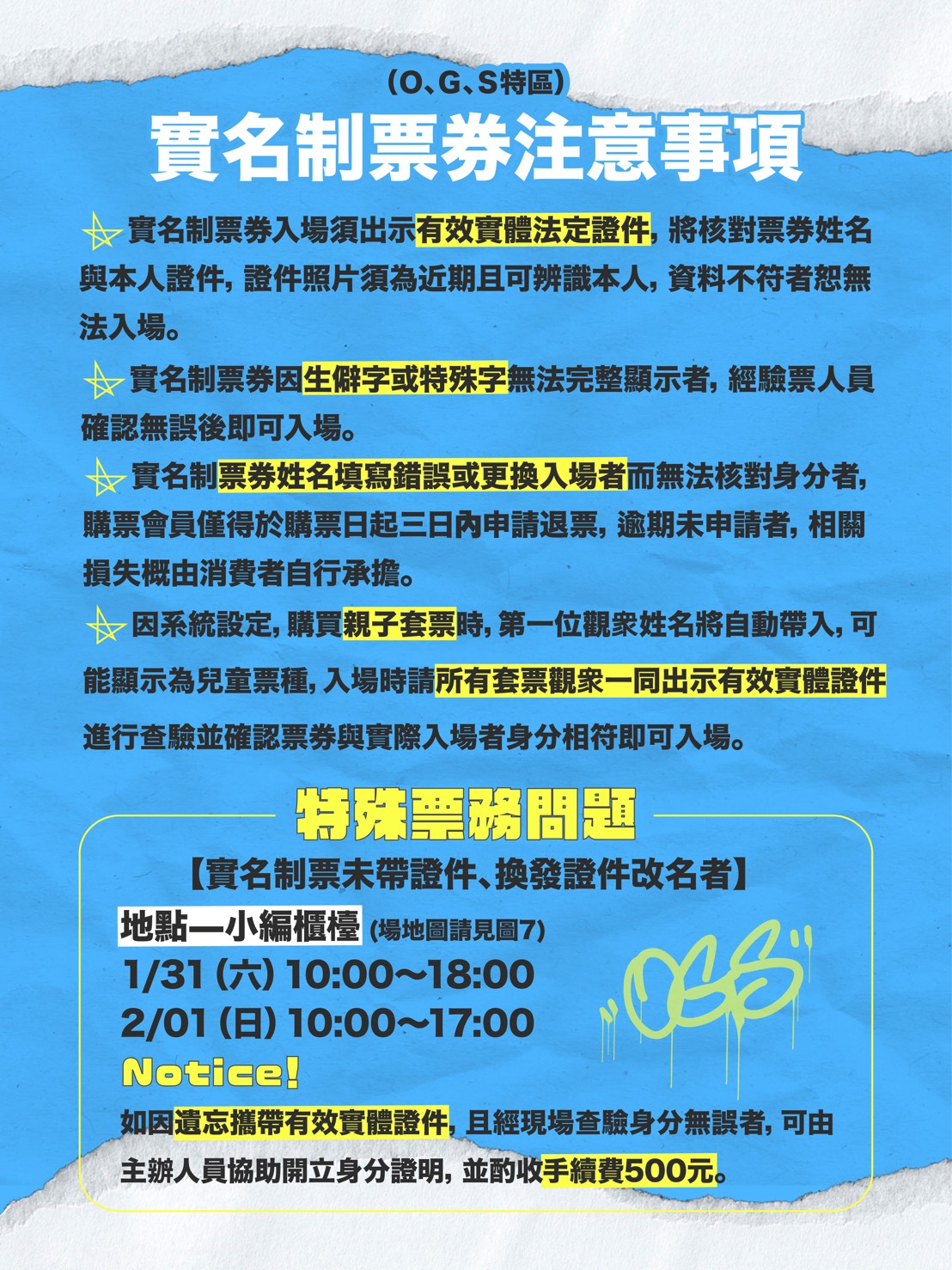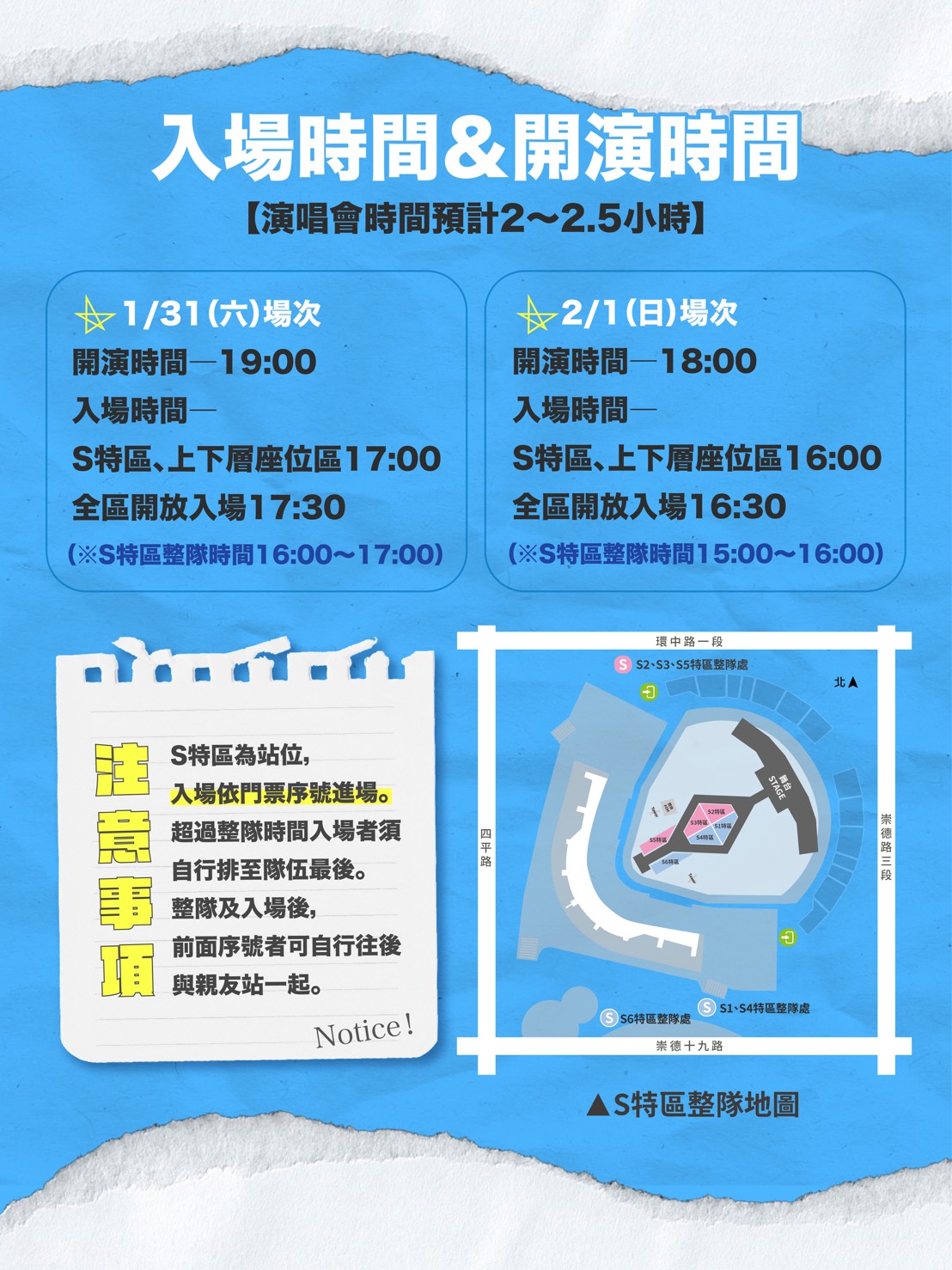 新聞局補充,在入場安全方面,演唱會部分區域採實名制票券入場,觀眾須攜帶本人有效身分證明文件正本配合查驗,全場需接受入場安檢,現場全面禁止吸菸、飲酒及使用電子煙,亦禁止攜帶大型包包、行李箱、自拍棒、腳架、無人機、雷射筆等可能影響安全之物品,請樂迷提早到場並配合現場人員指示。