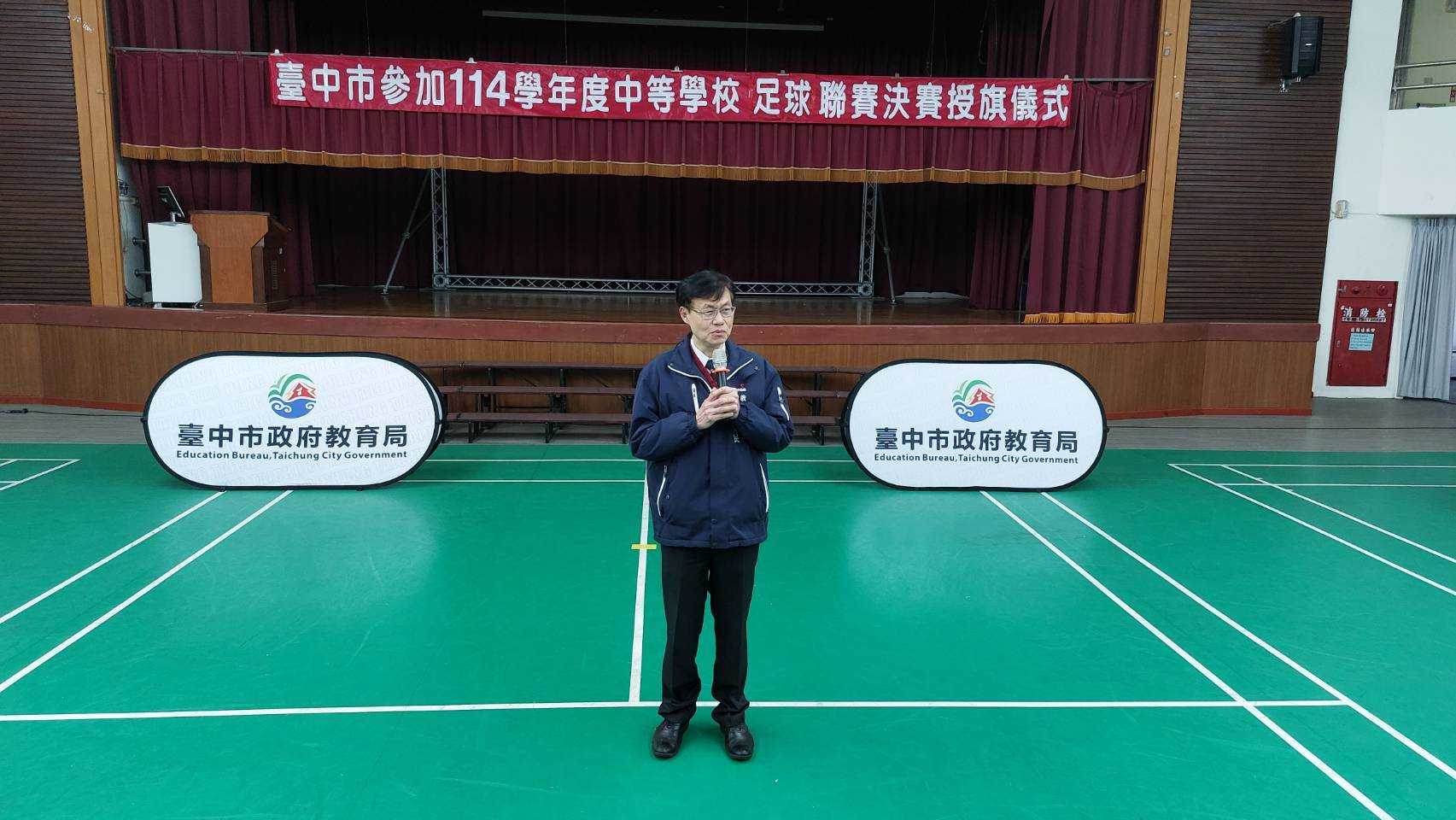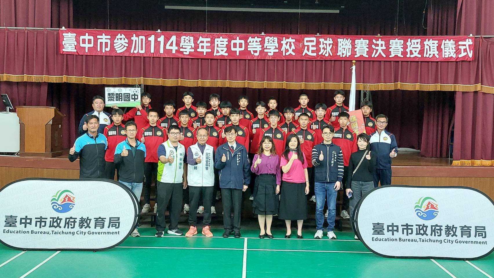 114學年度中等學校足球聯賽(HFL)將於3月10日至15日陸續開踢,台中市政府教育局長蔣偉民今(5)日於惠文高中為參加決賽的4隊88名選手們授旗,並代表市長盧秀燕致贈加菜金,為教練及選手們加油打氣,期許小將們在賽場上,踢出自己的夢想,凱旋歸來。