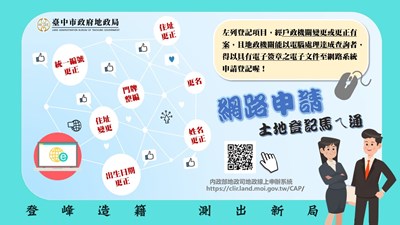 臺中市政府地政局已開放網路申請土地登記,讓民眾以網路替代馬路~